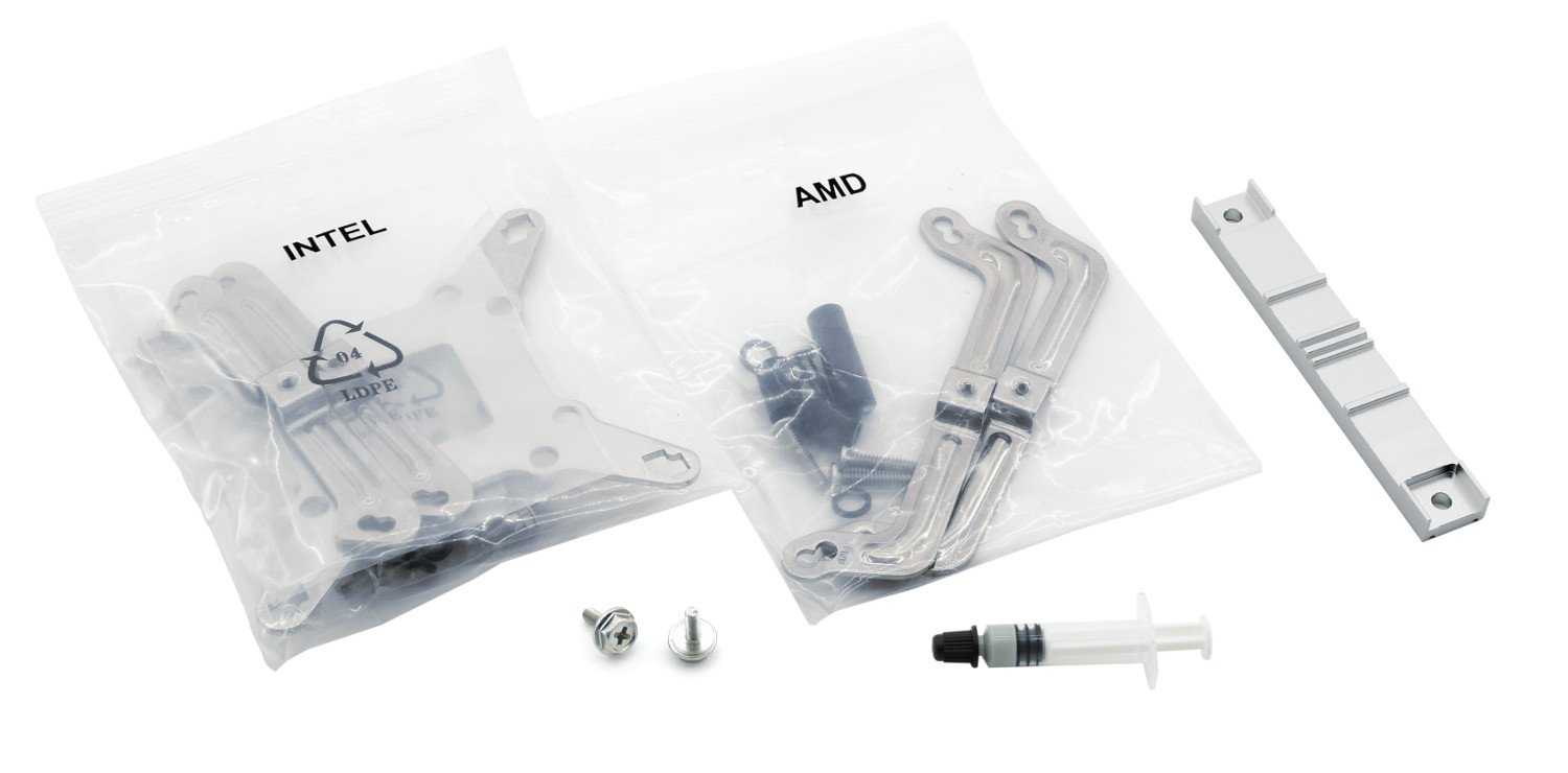 Крепеж разделен на два подписанных пакета AMD и Intel, которые помогают быстро разобраться в том, что и где потребуется. Здесь же находится небольшой тюбик термопасты, рейка фиксации и два необходимых винтика.