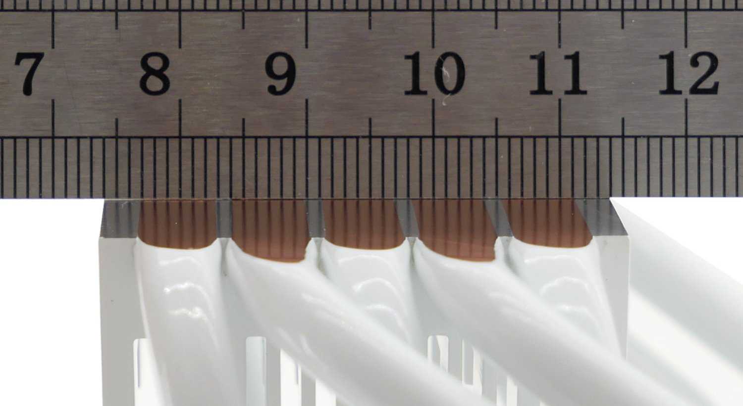 Тест с металлической линейкой демонстрирует едва заметный горбик, что заслуживает похвалы создателям. Зазора между алюминиевым радиатором и медными тепловыми трубками практически не ощущается.
