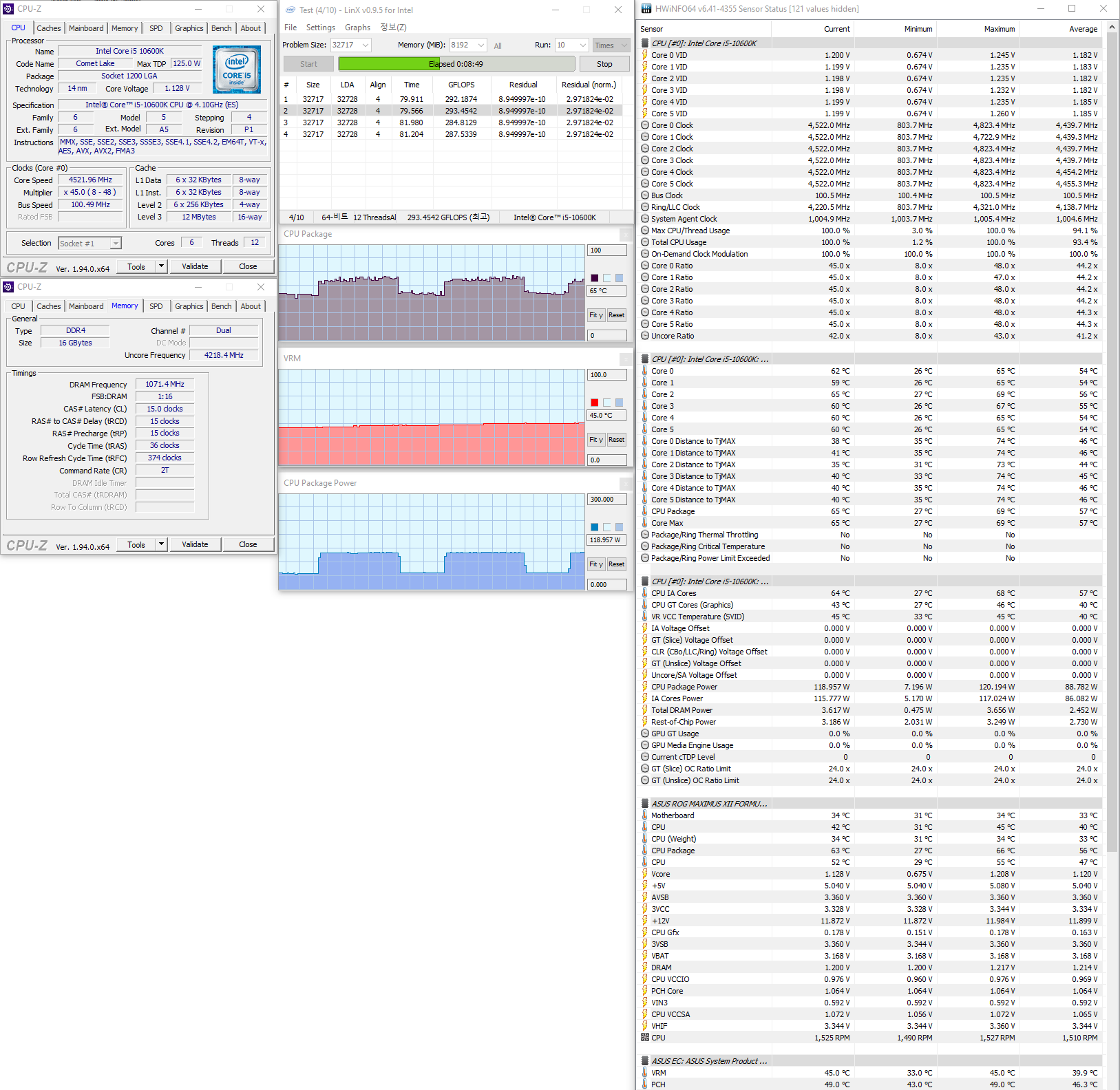 Начнем тестирование на процессоре Intel Core i5-10600K. Вначале результаты снимались с процессора в стоковом состоянии с уровнем потребления ~117 Вт, демонстрирующем стабильную частоту по всем ядрам 4500 МГц при напряжении 1,15 В в стресс-тесте LinX версии 0.9.5.