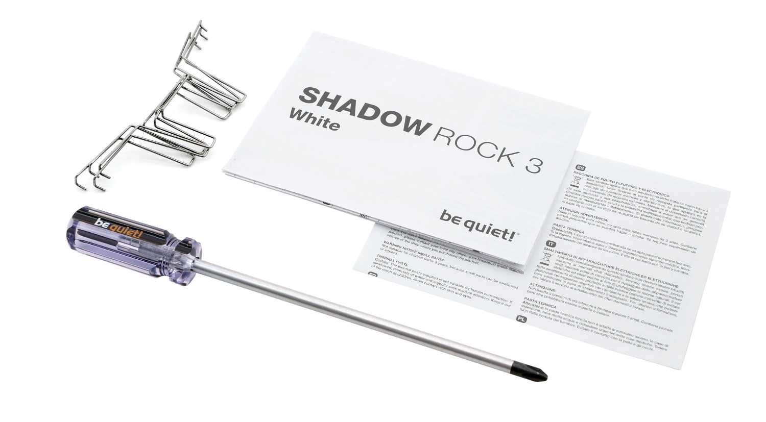 be quiet! Shadow Rock 3 White поставляется с фирменной отверткой be quiet! с магнитным наконечником, которая очень поможет в установке кулера. Также в комплекте идут две пары скоб для фиксаций вентиляторов и руководство пользователя.