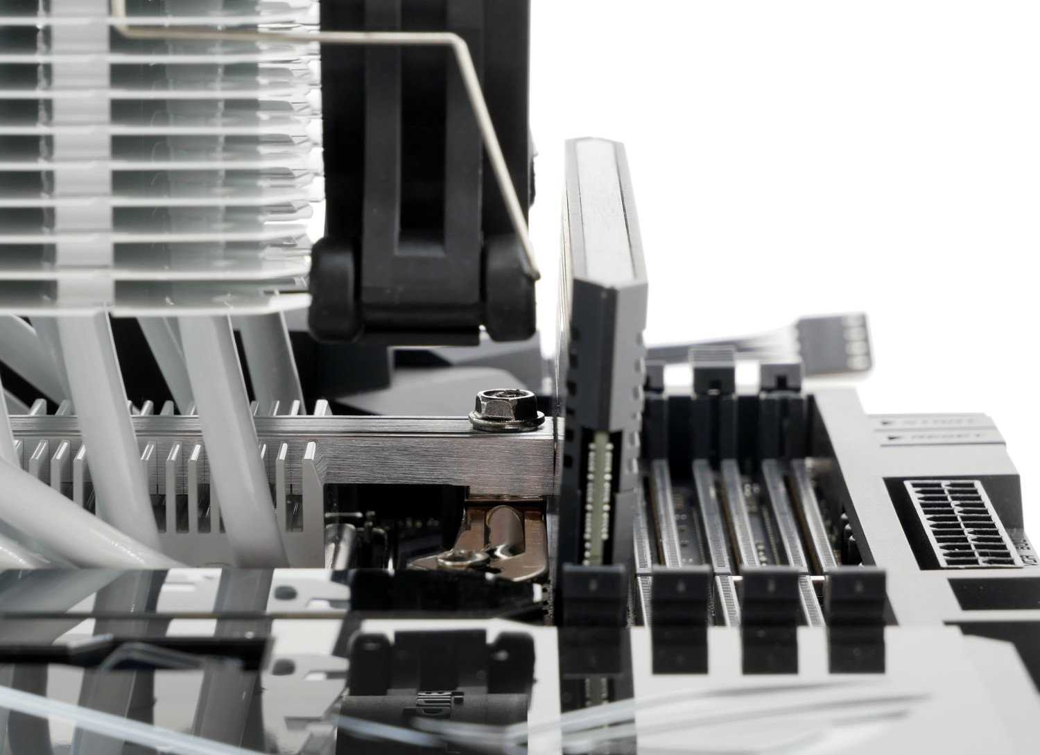 Производителем заявлена поддержка высоких модулей оперативной памяти, и это является правдой! Вентилятор никак не мешает планкам DDR4, а вот прижимая пластина все же упирается в радиатор крайнего модуля, хотя будем честны — я использовал одни из самых высоких и «толстых» модулей.