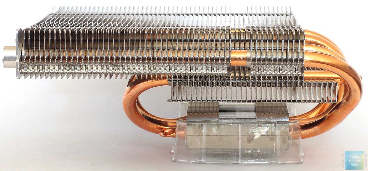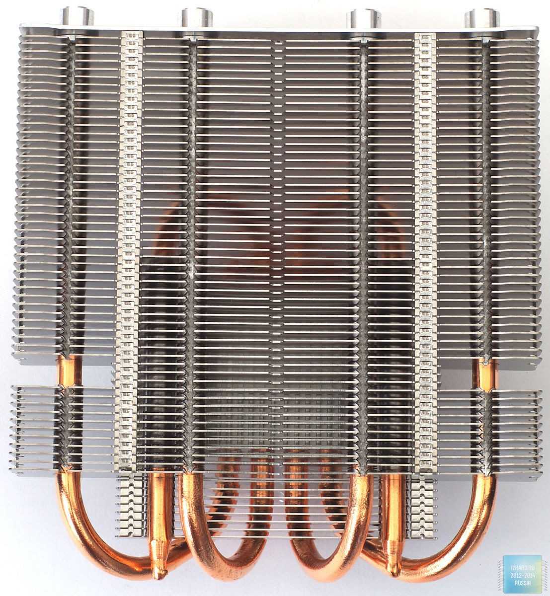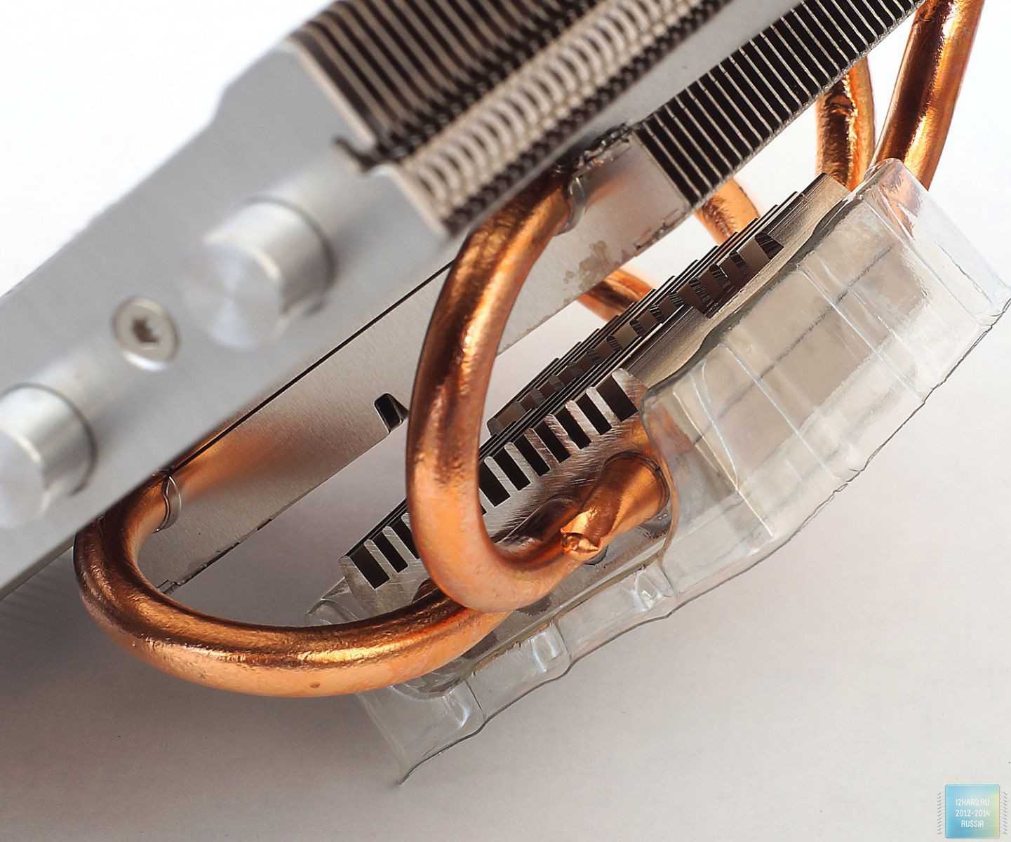 Крайние тепловые трубки контактируют только с верхними пластинами радиатора, причем пластины имеют прорези в местах крепления трубок, тем самым воздушный поток будет напрямую их обдувать.