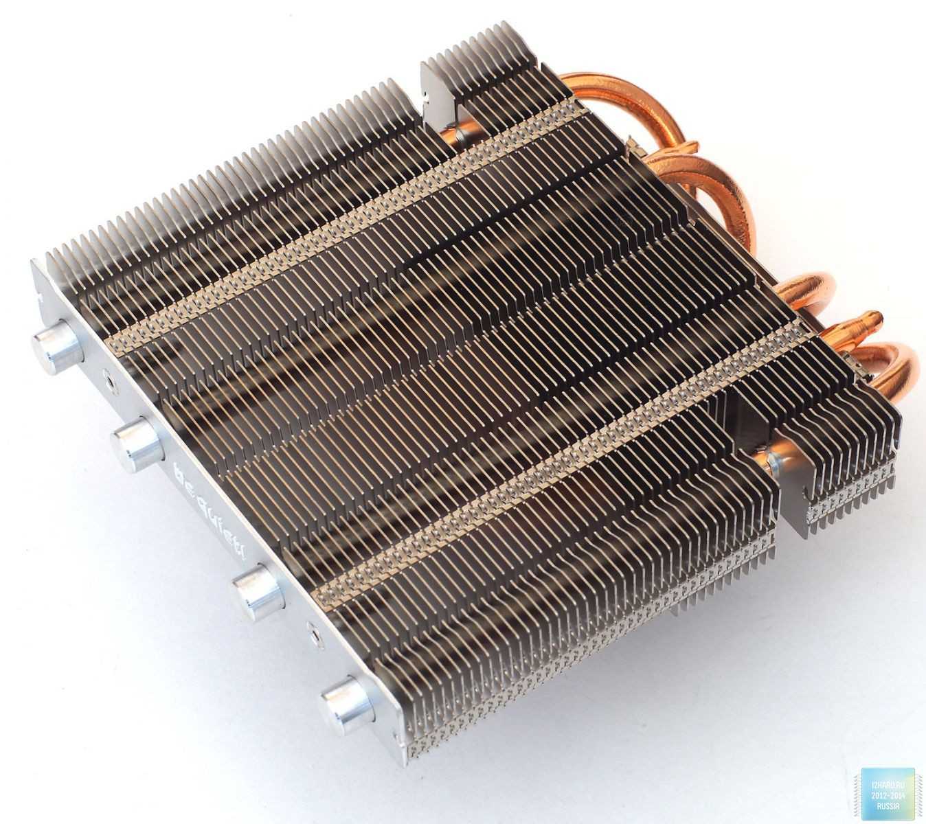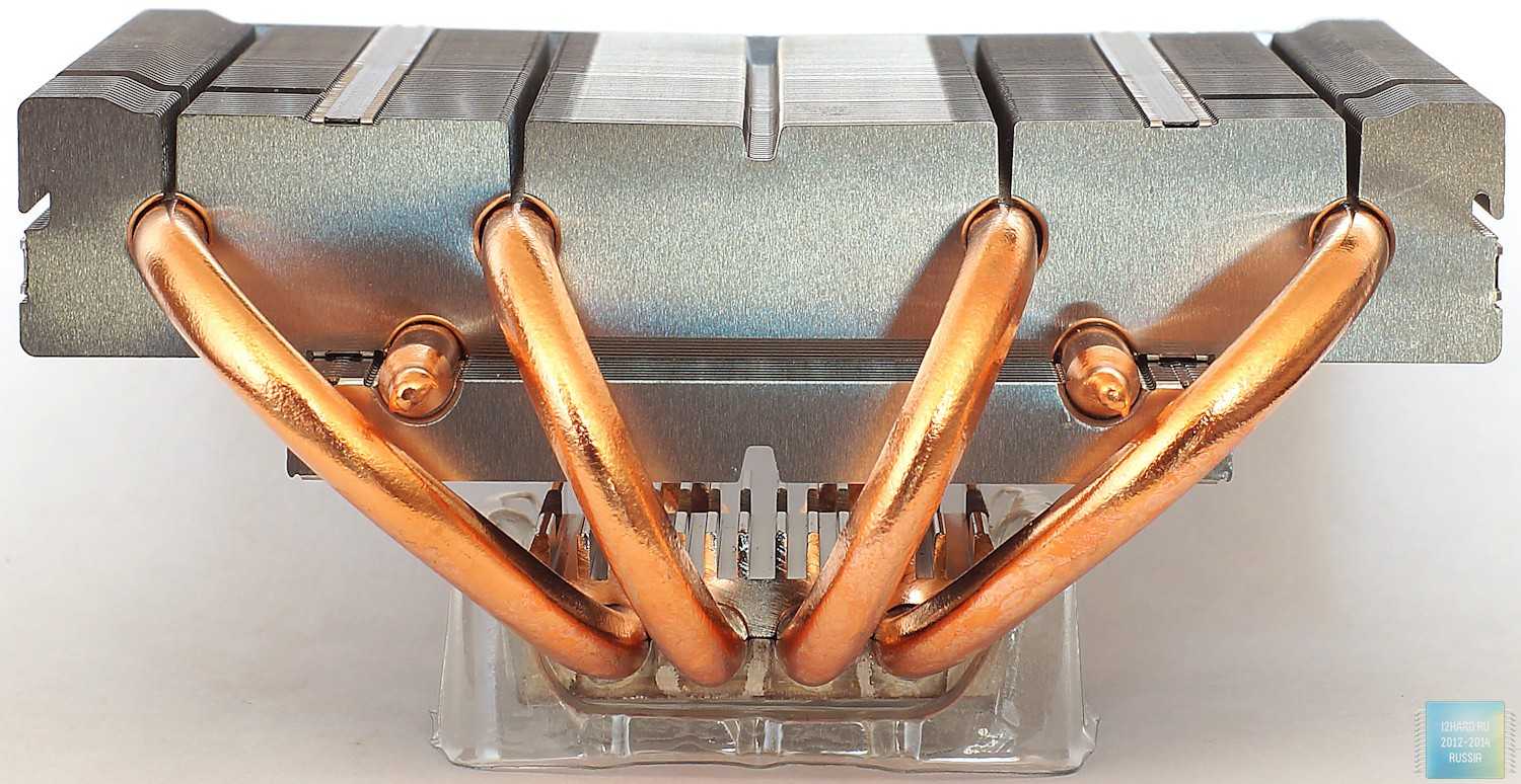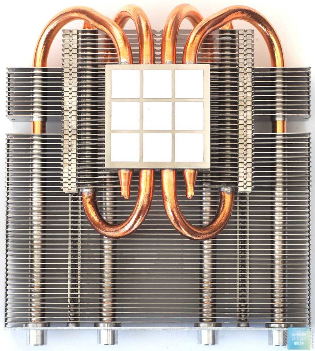 Крайние тепловые трубки контактируют только с верхними пластинами радиатора, причем пластины имеют прорези в местах крепления трубок, тем самым воздушный поток будет напрямую их обдувать.