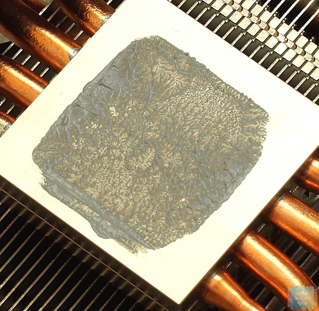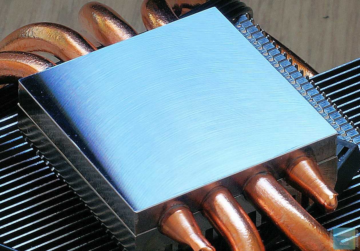 Пайка также используется для лучшего контакта трубок с подошвой. Удалив термопасту с основания можно увидеть следы обработки, но оно гладкое, хоть и имеет небольшую выпуклость в плоскости, перпендикулярнойтепловым трубкам.