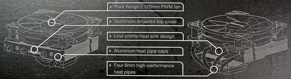 Shadow Rock LP состоит из медного основания, из которого выходят четыре 6-мм тепловые трубки, на них «подвешен» плоский радиатор. Штатно на радиатор монтируется 120-мм вентилятор Pure Wings 2 PWM. Установка дополнительного вентилятора не предусмотрена.