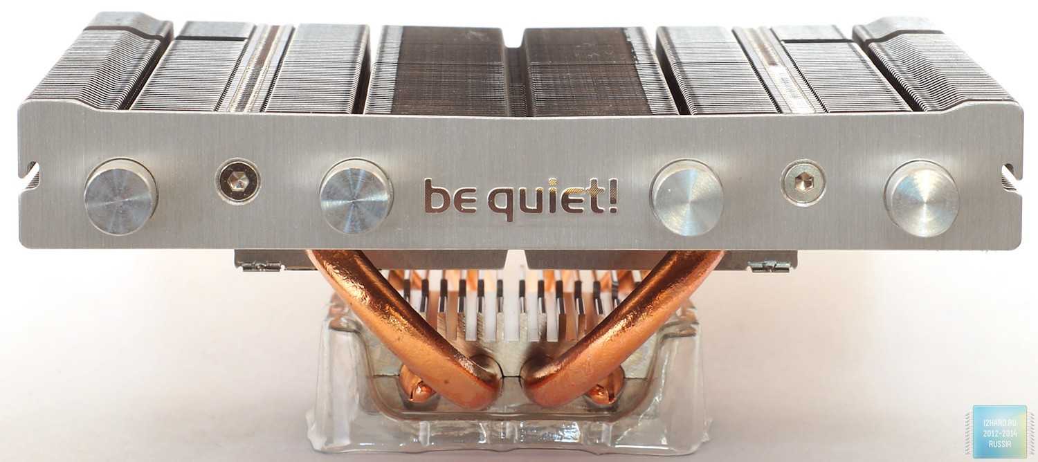Имеется и характерная черта для кулеров be quiet! – толстая алюминиевая декоративная пластина с надписью be quiet! и металлические колпачки, скрывающих концы трубок.