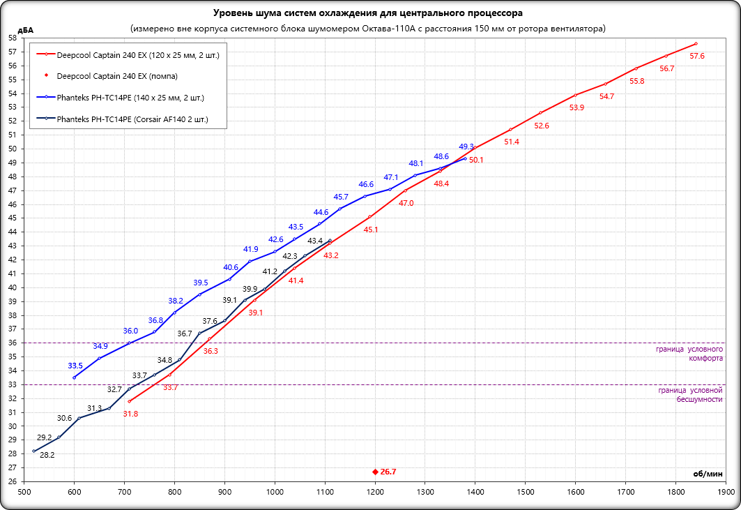 Уровень шума замерялся в открытом корпусе с расстояния 50 см, других источников шума в виде активных вентиляторов в тестовой системе нет.