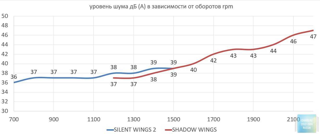 Как видим по графикам, SILENT WINGS 2 не выходит за рамки комфортного уровня вплоть до максимальных оборотов. SHADOW WINGS после 1500 rpm начинает отчетливо шуршать, с ростом оборотов до максимальных его уже не назвать тихим.