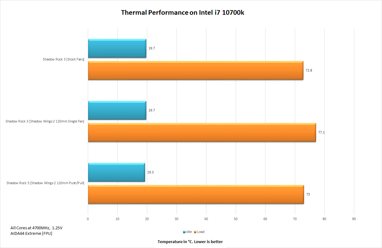 There is a difference of roughly 4.3°C between the stock fan on the cooler and the Shadow Wing 2 120mm PWM white edition fan. We have also tested the cooler using the push/pull configuration of these fans where there was a negligible difference between the stock fan and the push/pull configuration of the Shadow Wings 2 120mm PWM white edition fans.