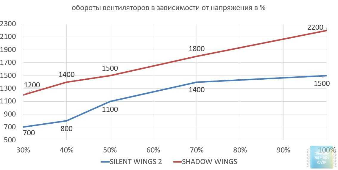 В таблице показана зависимость оборотов вентиляторов от напряжения, где 100% — напряжение 12 В.