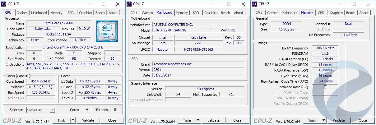 В качестве центрального процессора использовался Intel Core i7-7700K.При этомчастота процессора была номинальной. Роль платформы выполняла материнская плата ASUS Z270F Gaming. Память функционировала на частоте 2133 МГц с таймингами 15-15-15-36.