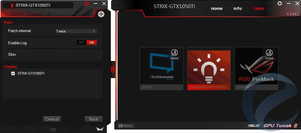 Полезной опцией является возможность ведения логов, а любители разнообразить интерфейс в будущем смогут сменить оболочку утилиты. Опциональные приложения XSplit и AURA станут доступны сразу после установки. Первое можно использовать для стриминга/записи игрового процесса, а второе, позволит настроить подсветку. А для проверки стабильности можно воспользоваться FurMark.