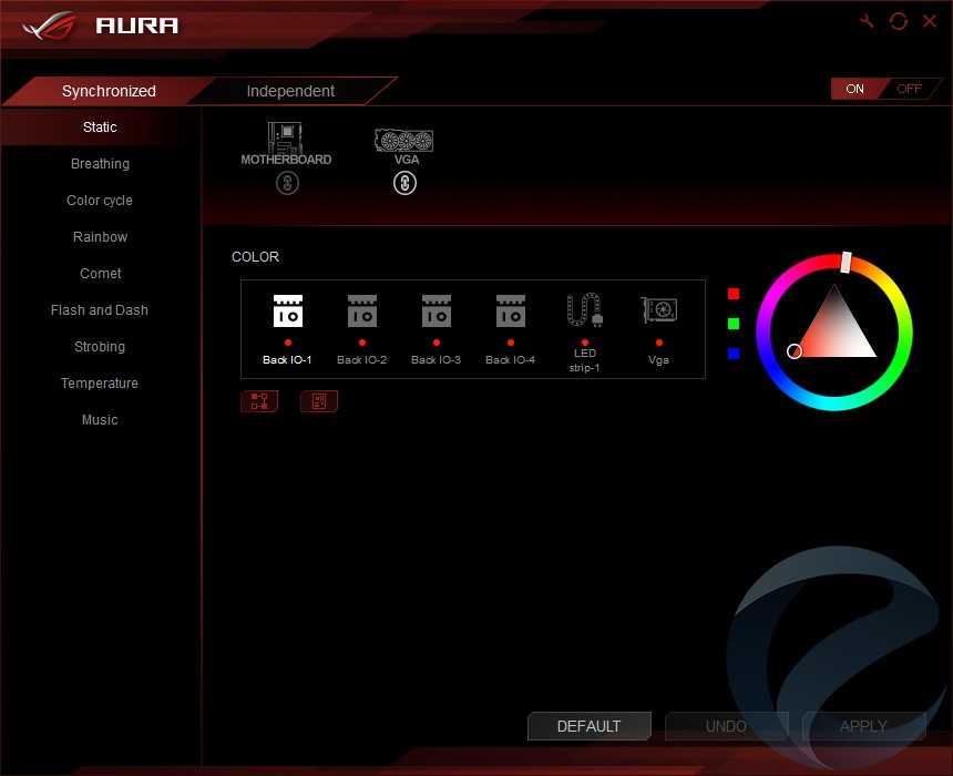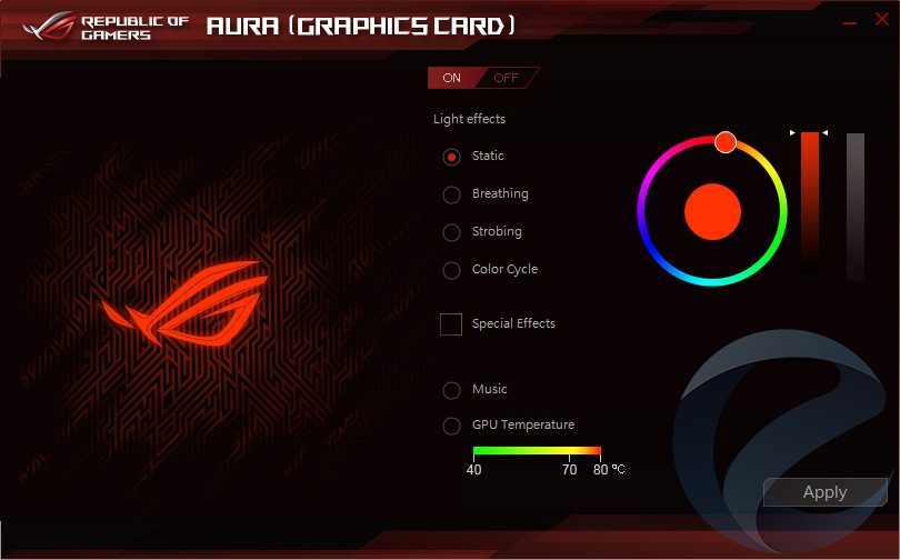 Остановимся и более подробно познакомимся с приложением AURA. Здесь можно задать любой цвет подсветки или вовсе её отключить. Для любителей динамики присутствуют всевозможные эффекты. Например, можно заставить подсветку работать в такт музыки. Хочу отметить, что при изменении какого-либо параметра все данные сохраняются в памяти и при следующей загрузке вам не придётся по новой выставлять цвет подсветки или же держать в автозагрузке саму утилиту.
