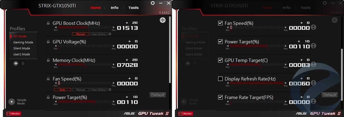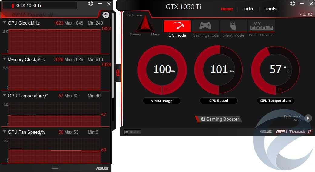 GPU Tweak II условно поделён на две части. Слева отображается мониторинг всевозможных значений, а справа осуществляется выбор режима работы видеокарты. В нашем случае OC mode/Gaming Mode/ Silent Mode.
