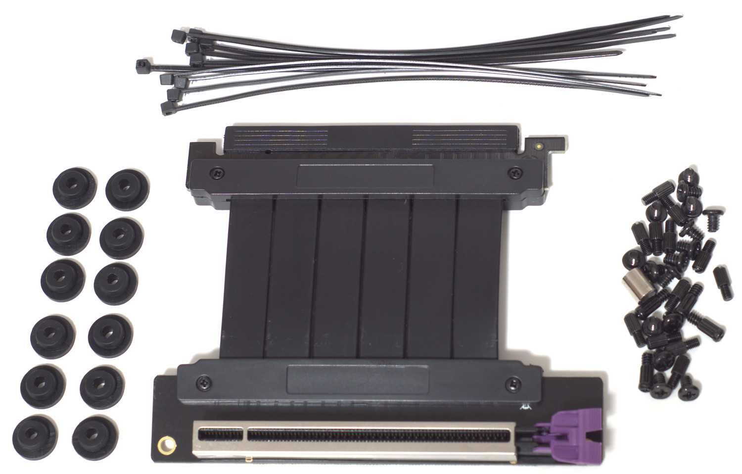 Вместе с набором винтов и одноразовыми стяжками приятным дополнением является наличие резиновых демпферов для вентиляторов/накопителей и, что особенно может быть важно, имеется PCIe 3.0 x16 райзер-адаптер.