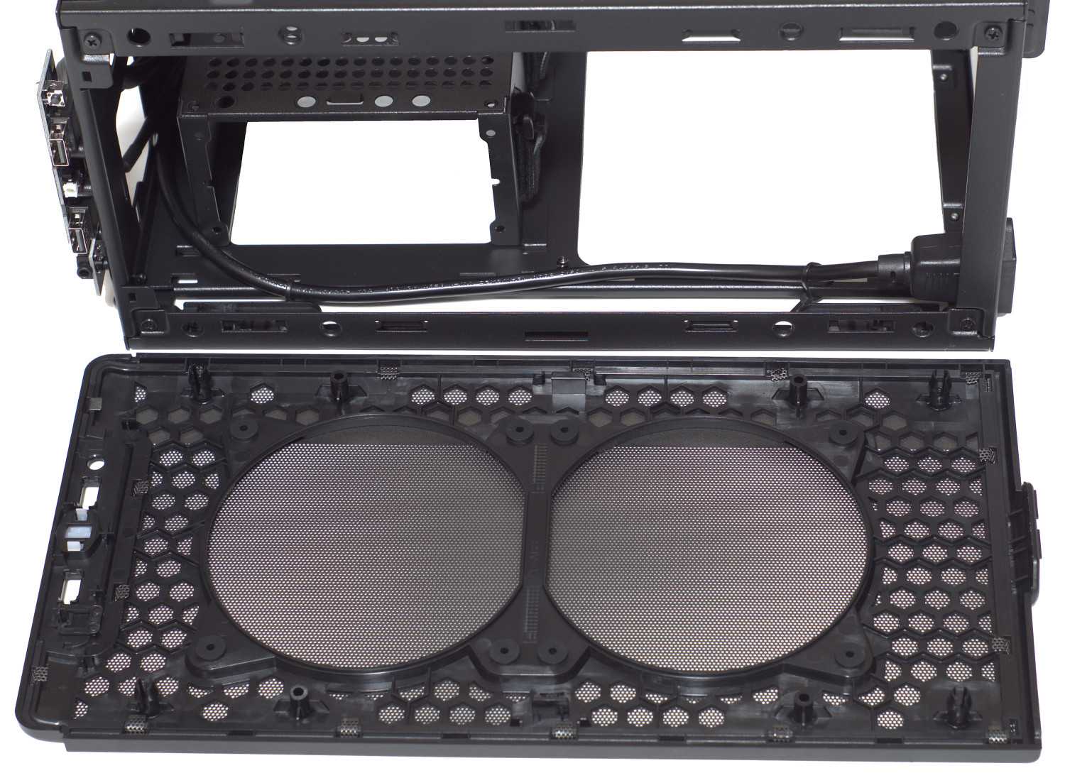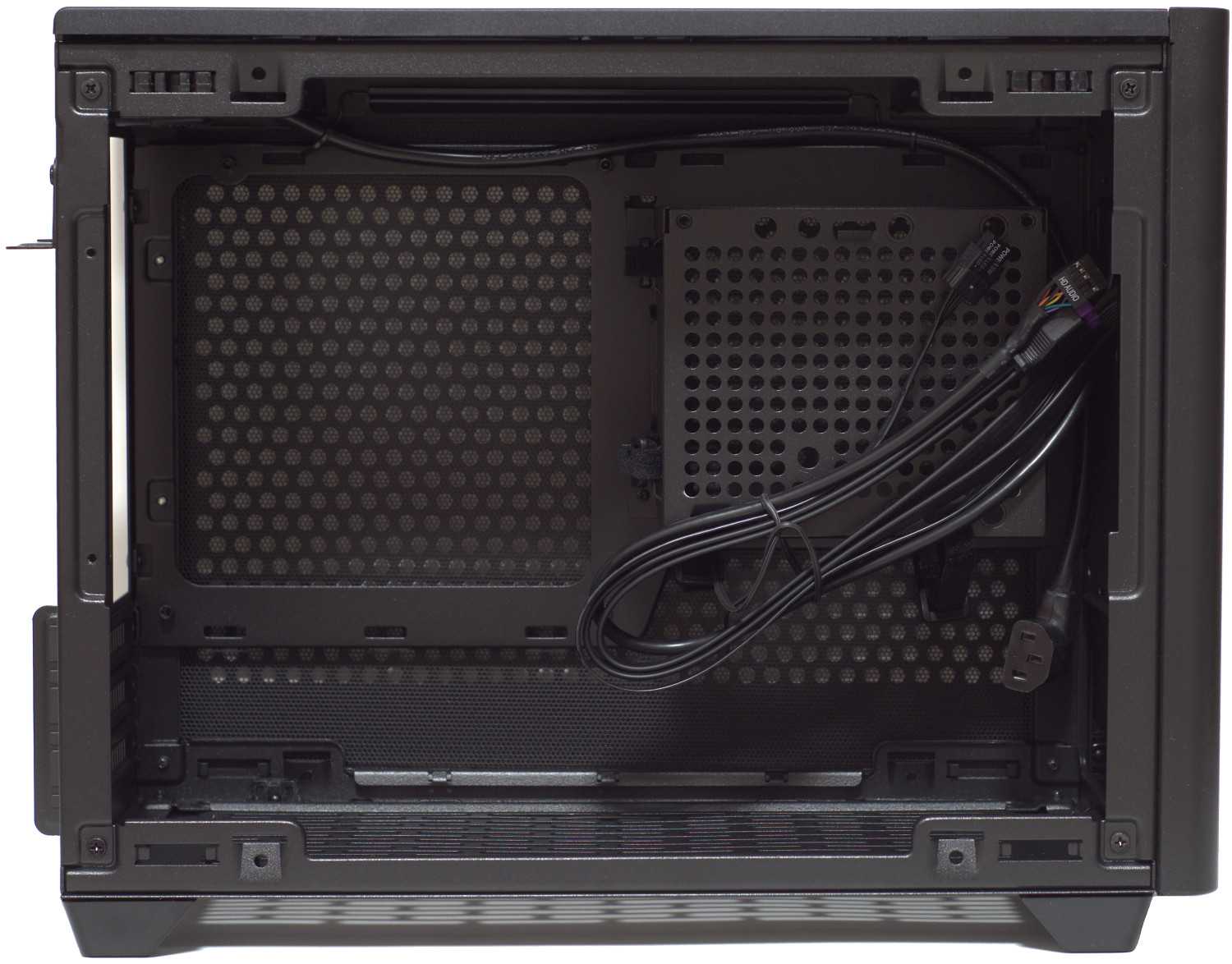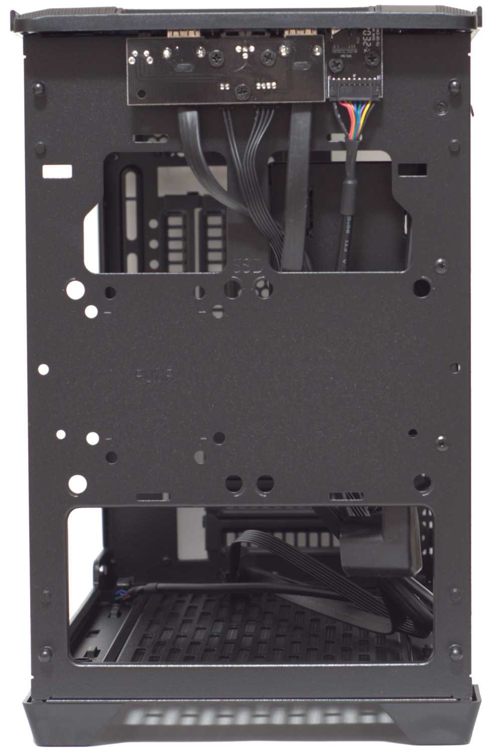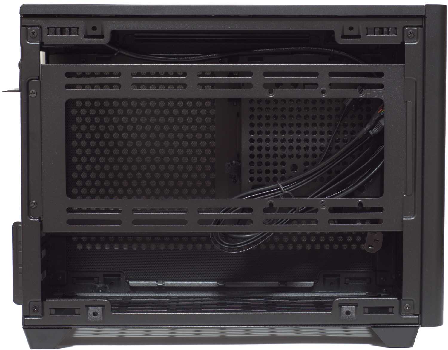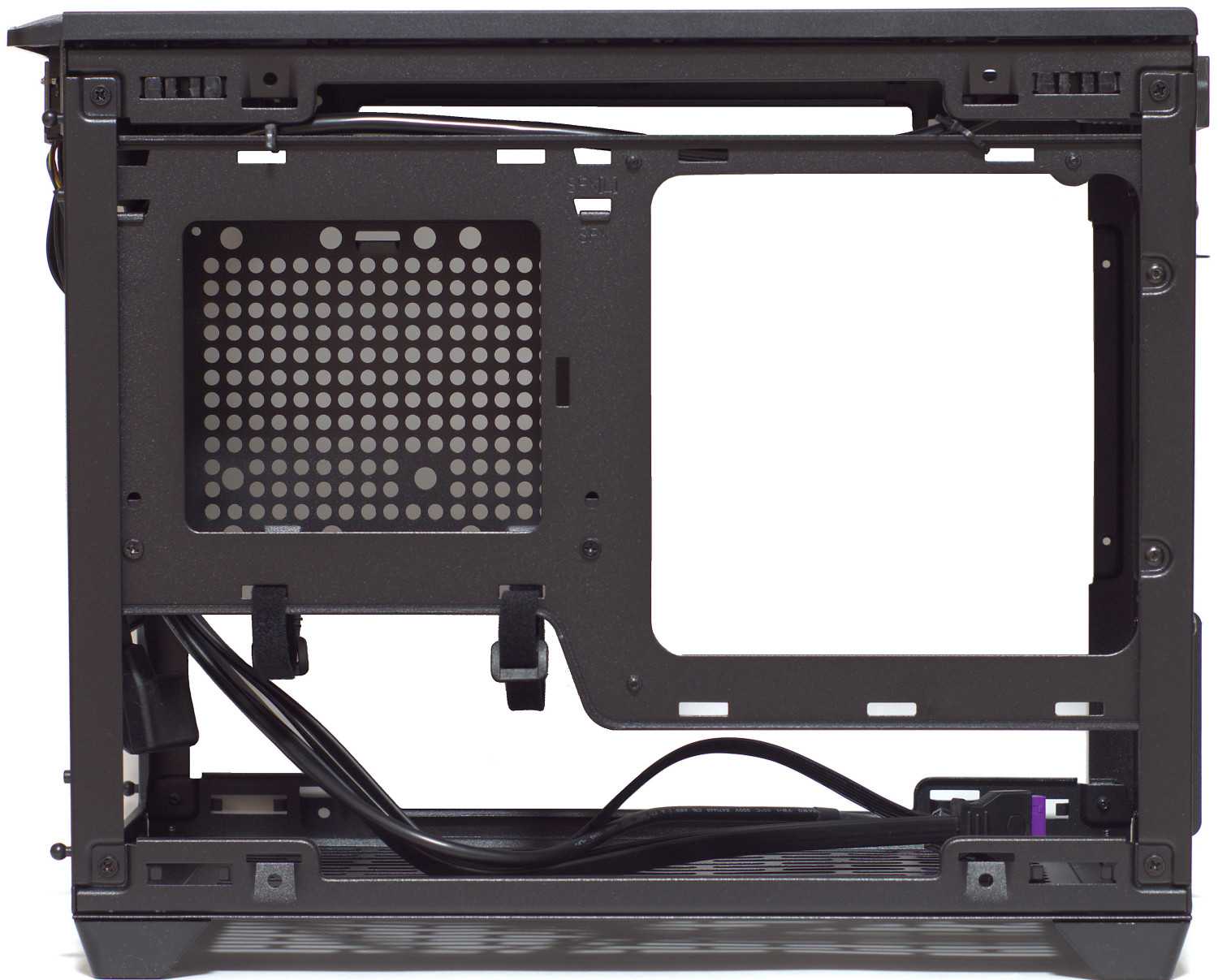 После демонтажа крепления можно увидеть компоновку. Имеется одно общее пространство, где размещается mini ITX/mini DTX материнская плата (максимальный размер — 244 мм х 226 мм), видеокарта длиной до 330 и рамка-крепление блока питания SFX/SFX-L.