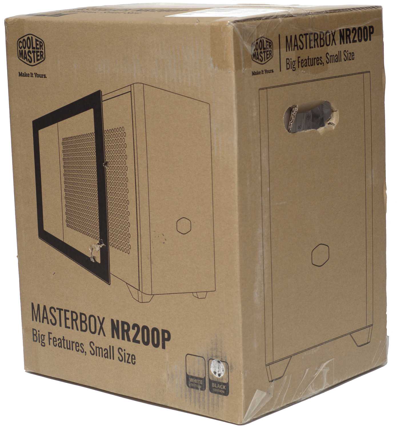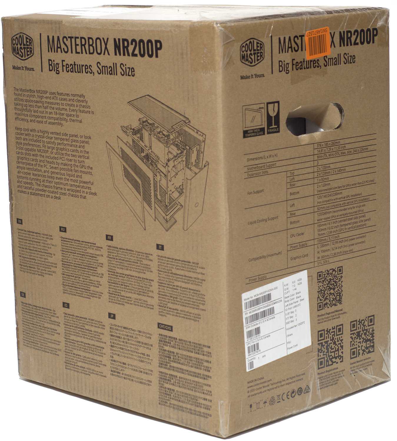 Коробка с корпусом Cooler Master MasterBox NR200P не отличается изысканным дизайном, но размещенная на ней информация достаточно подробная, чтобы можно было оценить весь функционал. Так, на лицевой стороне пользователь может увидеть внешний вид корпуса, по которому можно понять, что рассматриваемая нами модель поставляется с двумя боковыми стенками – вариант с перфорацией или с закаленным стеклом. Еще на коробке присутствует раздел с техническими характеристиками и краткое многоязычное описание. Сама коробка имеет сравнительно небольшие размеры, а с боков сделаны ручки. Несмотря на размеры, её вес хорошо чувствуется, всё-таки 7 кг.