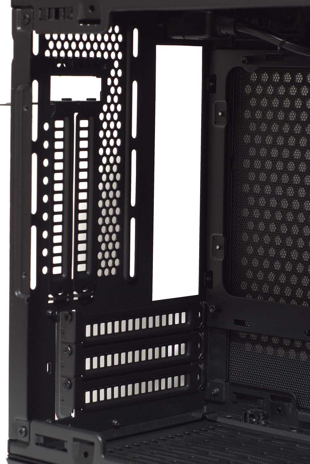 На задней стенке вместо вертикальной установки видеокарты можно разместить 92 мм вентилятор, при этом поднимать/опускать его можно в широком диапазоне.