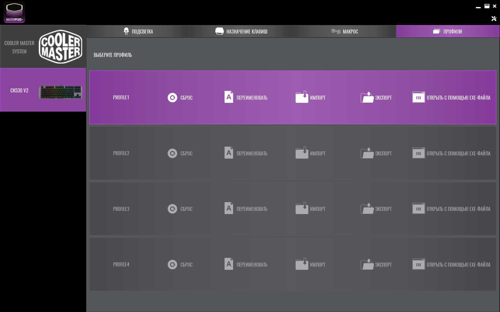 Профили. Через программу есть доступ к четырем профилям. Их можно экспортировать, импортировать, привязывать к программам. Через комбинации клавиш доступ к ним осуществляется через Fn + F1–F4.