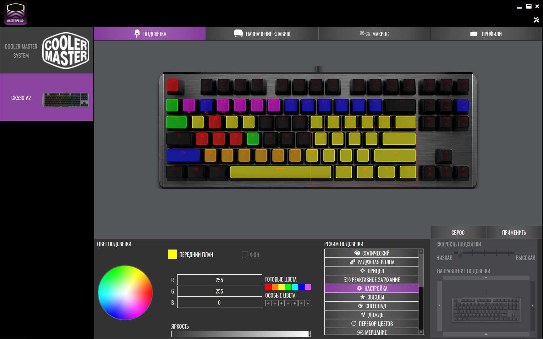 Режим «Настройка» позволяет выбрать желаемый статичный цвет для каждой из 87 клавиш.