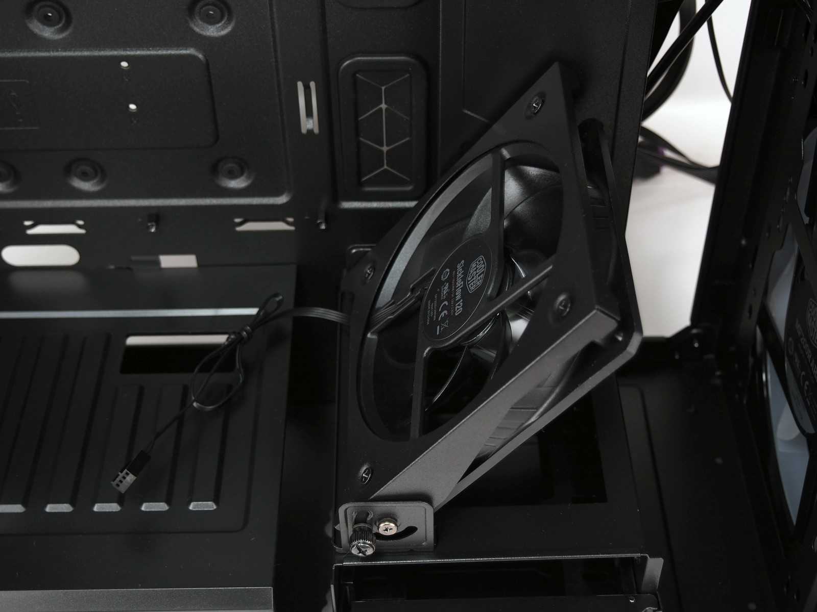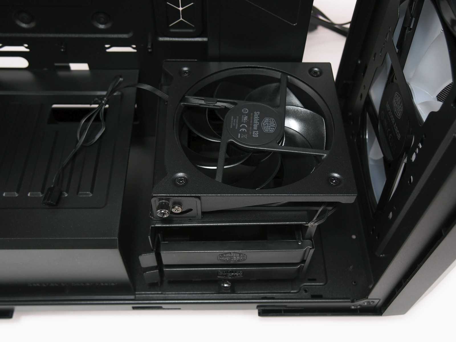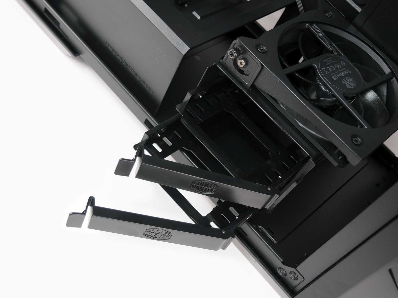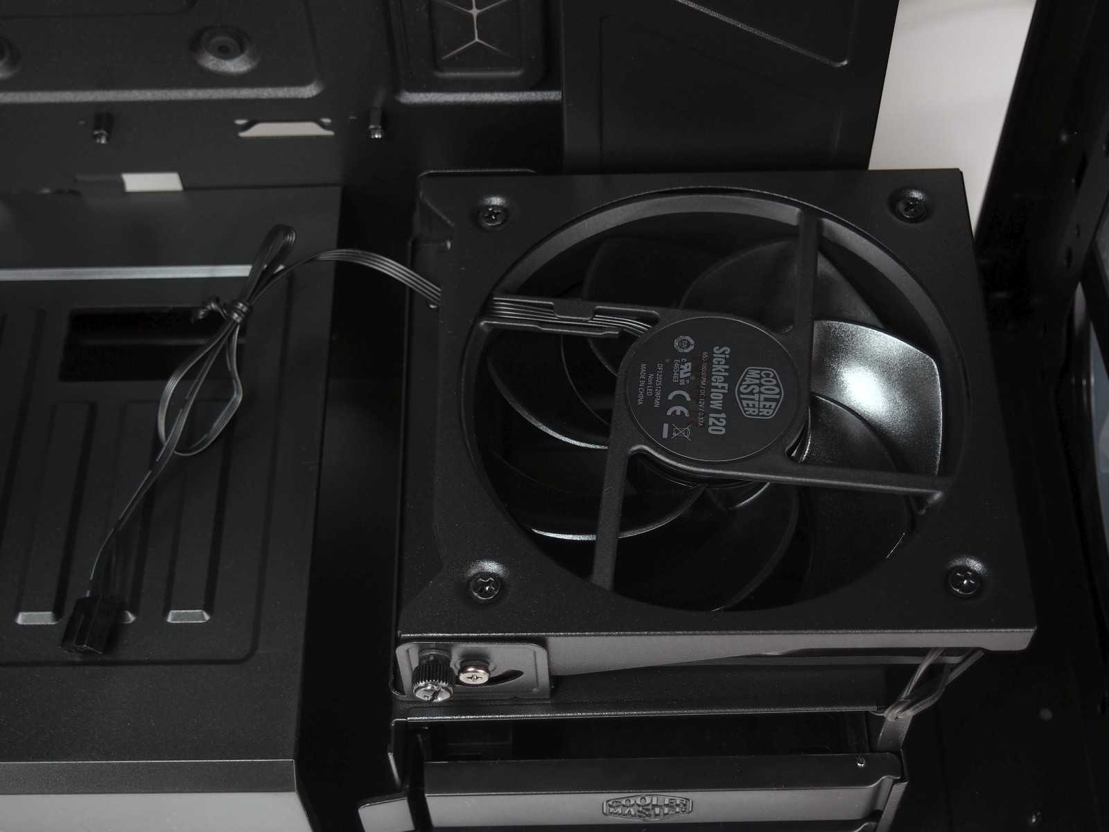 На корзину для накопителей установлен 120-мм вентилятор SickleFlow PWM на поворотном кронштейне. Это своеобразная фирменная фича HAF 500, призванная бороться с высоким тепловыделением современных графических адаптеров. Благодаря поворотному кронштейну пользователь может менять угол наклона, регулируя таким образом направление воздушного потока.