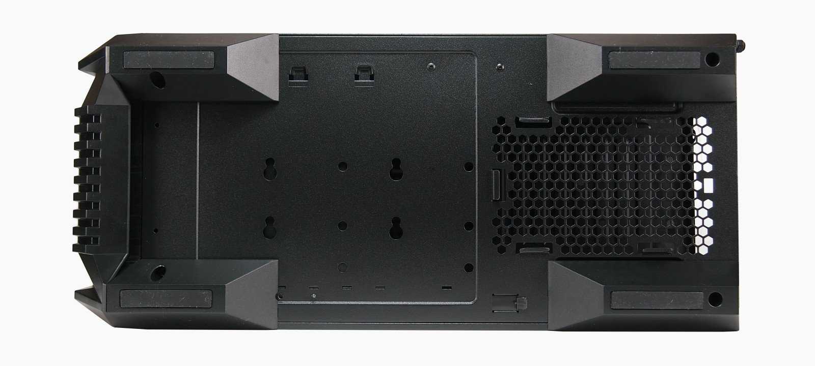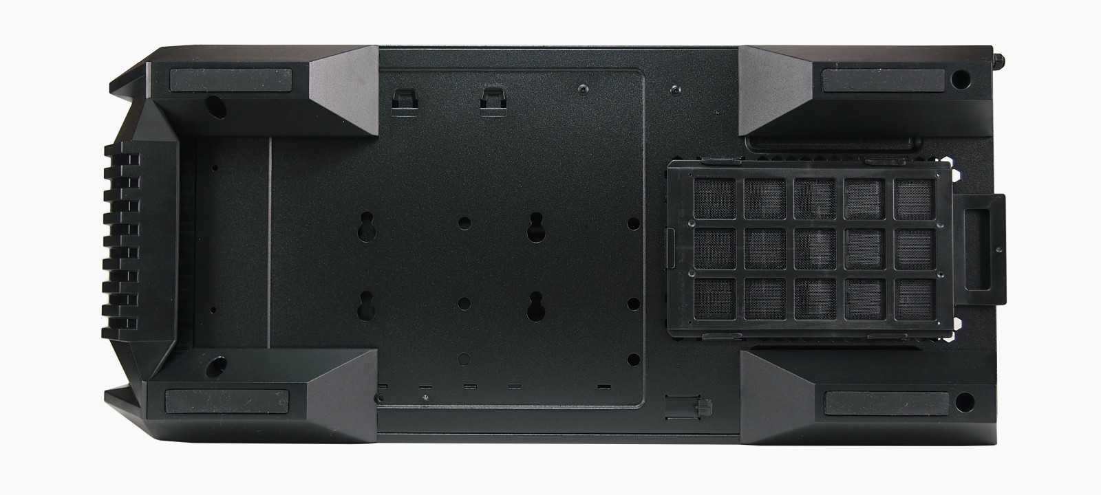 Донная часть HAF 500 также оборудована антипылевым фильтром. Он установлен в месте посадки блока питания. Для устойчивого положения на рабочей поверхности конструкция кейса предусматривает четыре опоры с резиновыми платформами.