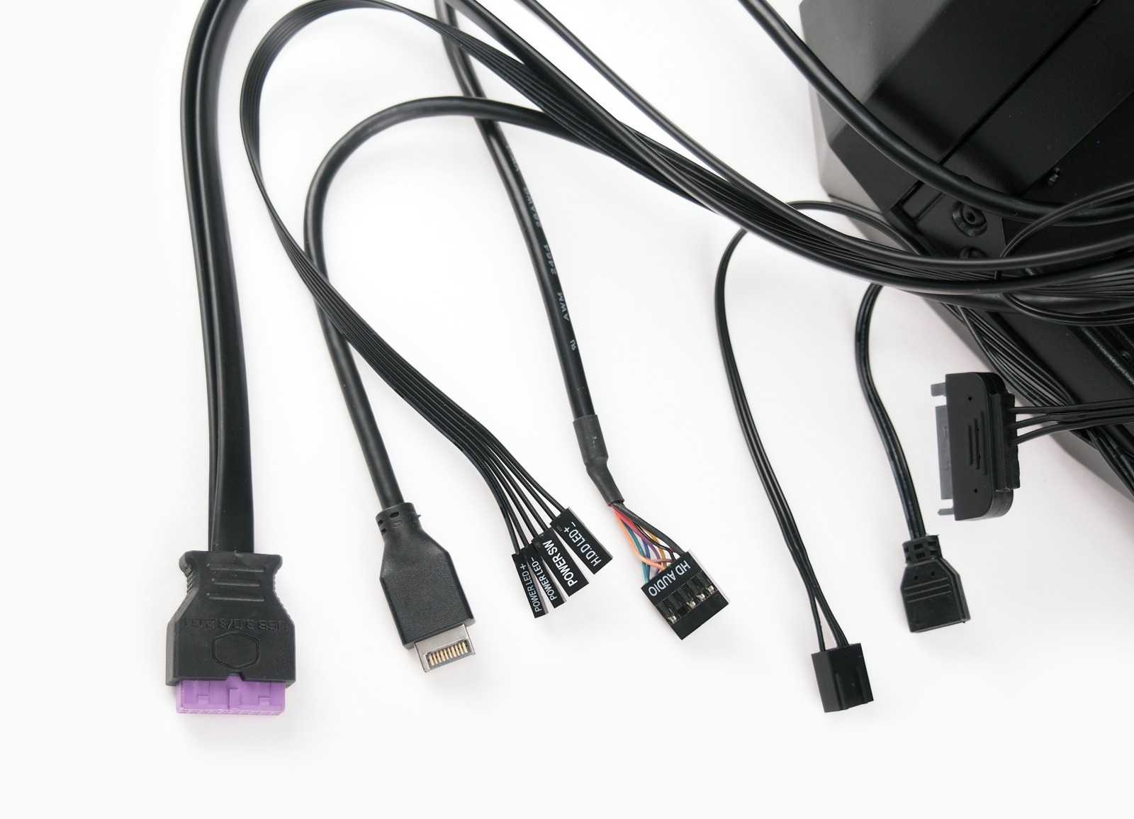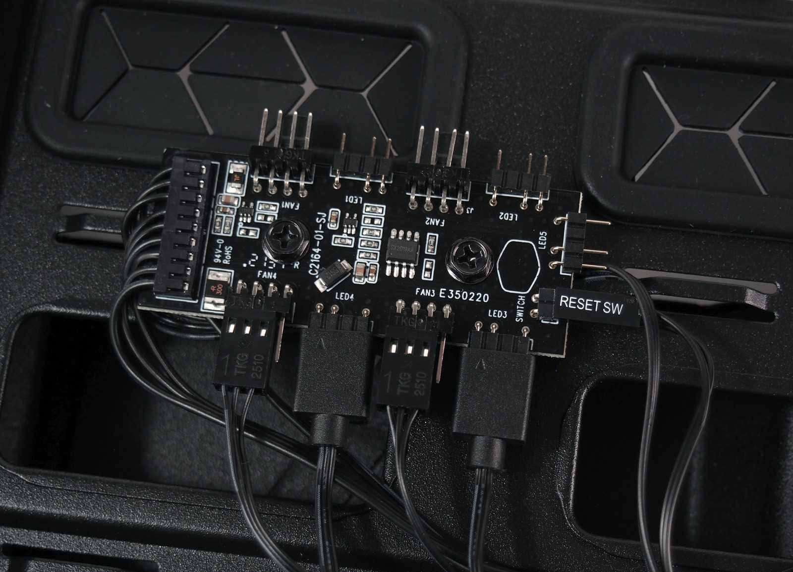 Помогает управлять вертушками и ARGB подсветкой фирменный контроллер, установленный на межсекционную стенку корпуса. Он рассчитан на четыре вентилятора с разъемами 4-пин PWM, а также на пять элементов подсветки с разъемом +5В RGB. Питание контроллера реализовано с помощью кабеля с 15-контактным разъемом SATA. Для подключения фронтальных кнопок управления и разъемов корпуса используется набор кабелей, продемонстрированных на фото ниже.
