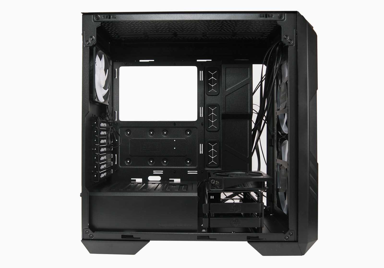 А так выглядит внутреннее пространство HAF 500, вместительности которого будет достаточно для продвинутой игровой сборки. Корпус рассчитан на установку башенных кулеров высотой до 167 мм и графических адаптеров длиной до 410 мм.