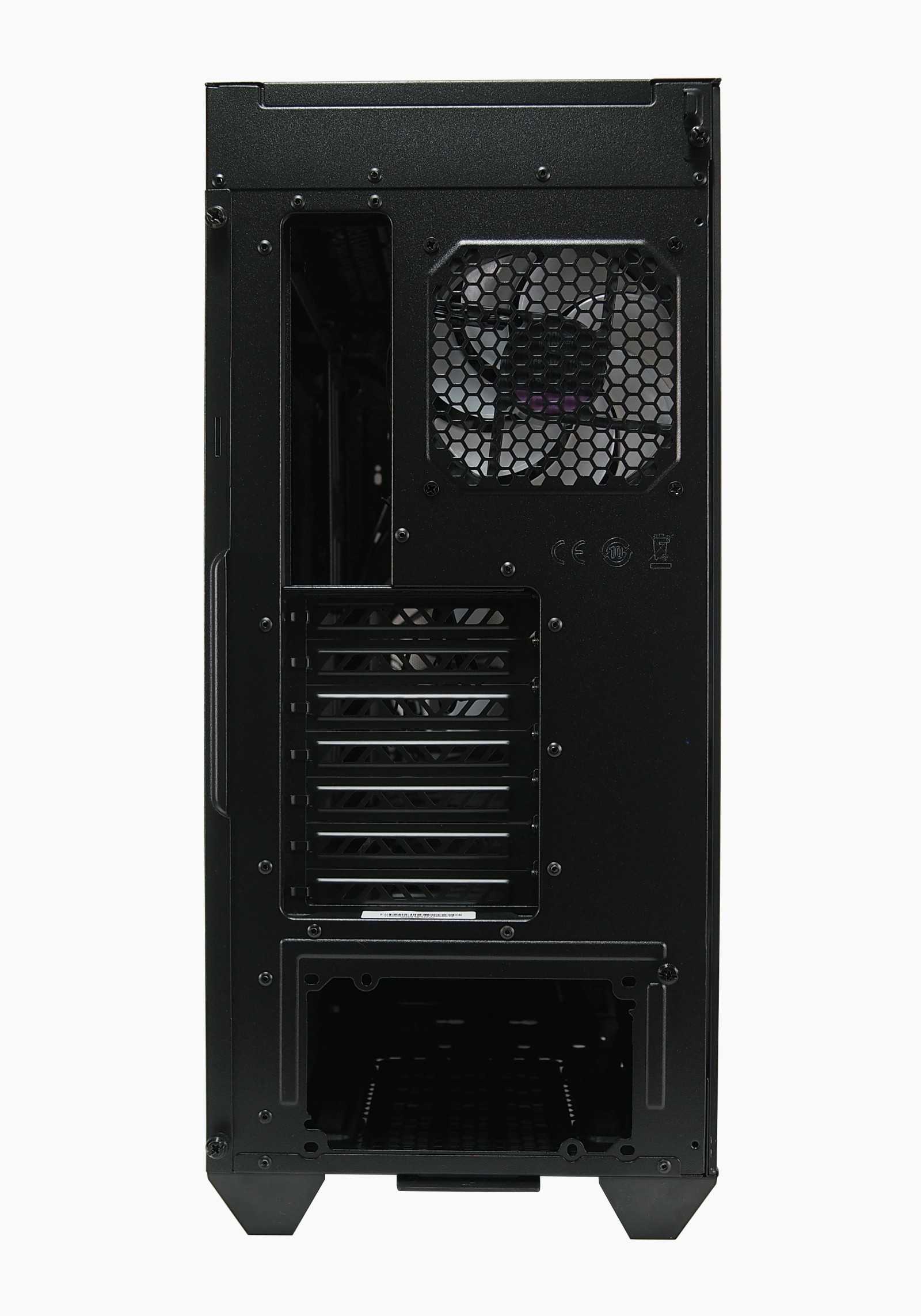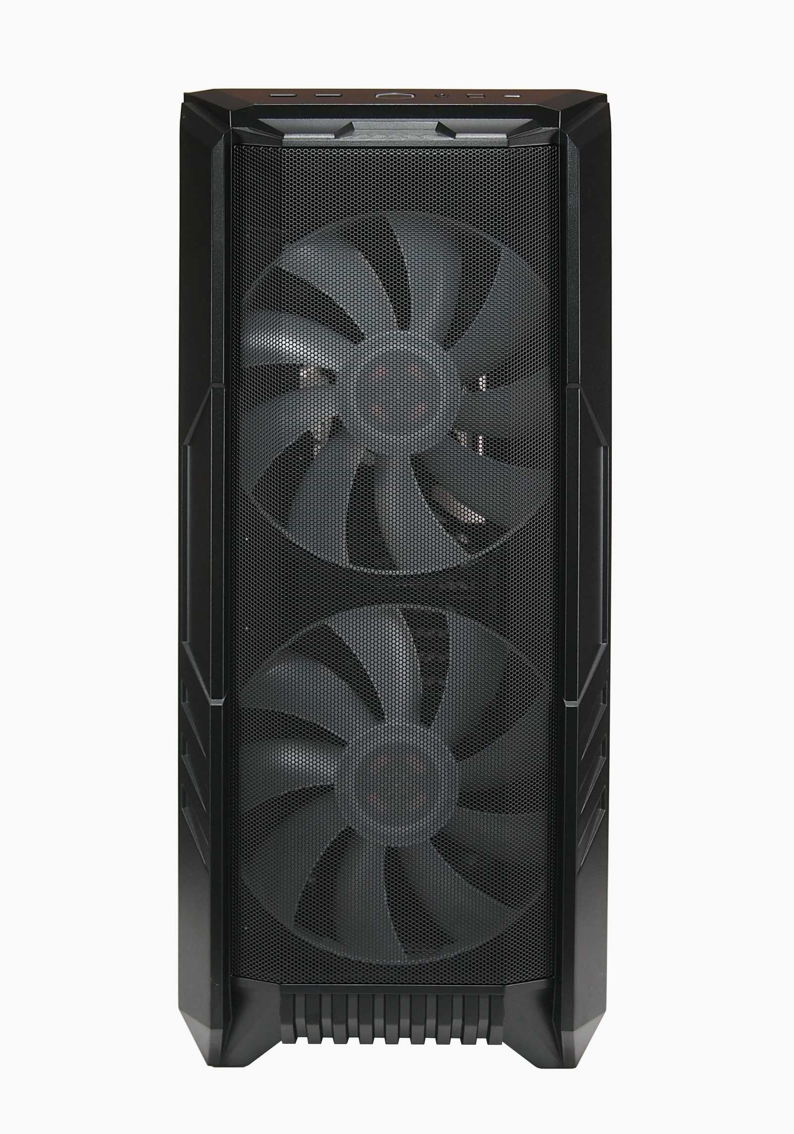 Визитной карточкой HAF 500 является передняя сетчатая панель, за которой установлены два 200-мм вентилятора с ARGB-подсветкой. С таким подходом этот кейс сразу претендует на хорошую продуваемость внутреннего пространства. Используемые вертушки рассчитаны на максимальную скорость вращения 800 об/мин, что позволяет надеяться на акустический комфорт. На тыльной стороне HAF 500 для вывода нагретого воздуха установлена одна 120-мм вертушка SickleFlow PWM. Она также оборудована адресуемой RGB-подсветкой для лучшей визуализации внутреннего пространства.