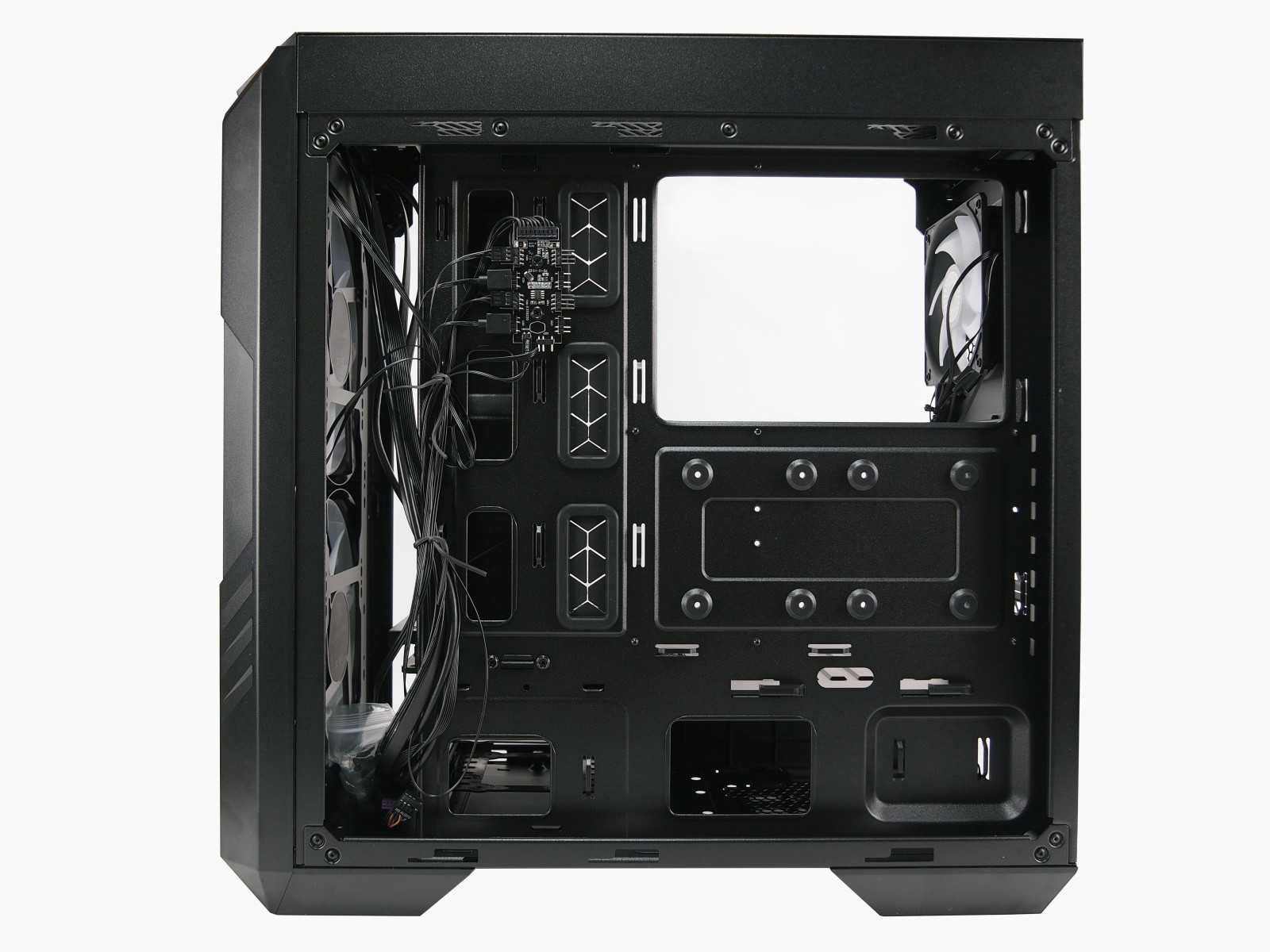 Открыв боковую крышку корпуса, можно оценить конструкцию кейса и организацию кабелей. Их у HAF 500 немало, учитывая множество кнопок и разъемов на панели кейса, а также три корпусных вентилятора с подсветкой.
