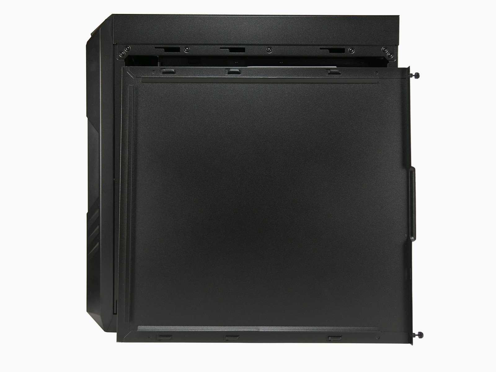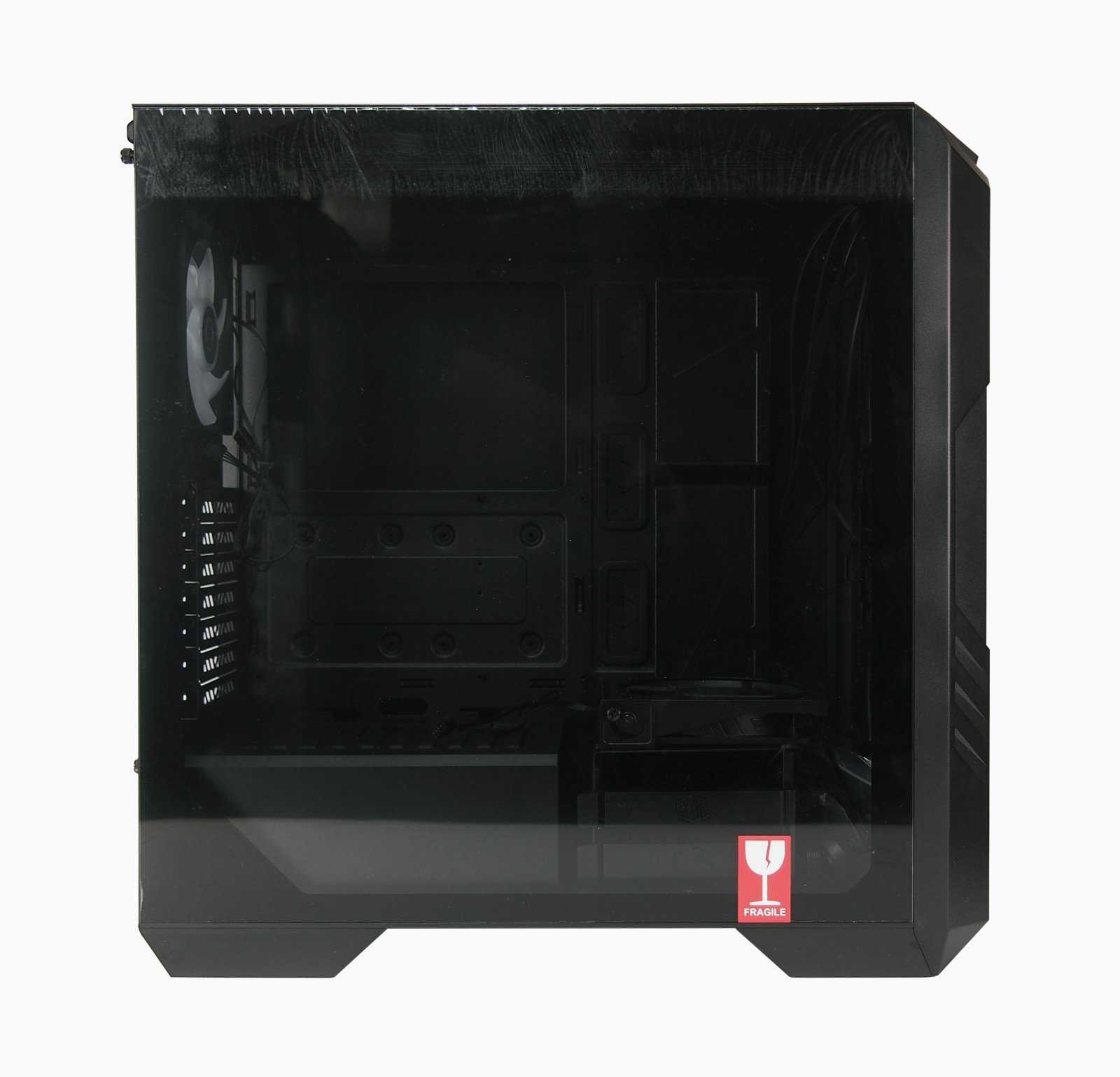 Главная боковая панель HAF 500 выполнена из закаленного стекла с тонировкой. Другая стенка корпуса сделана из цельного листа металла. Вся конструкция выполнена в строгом черном цвете.