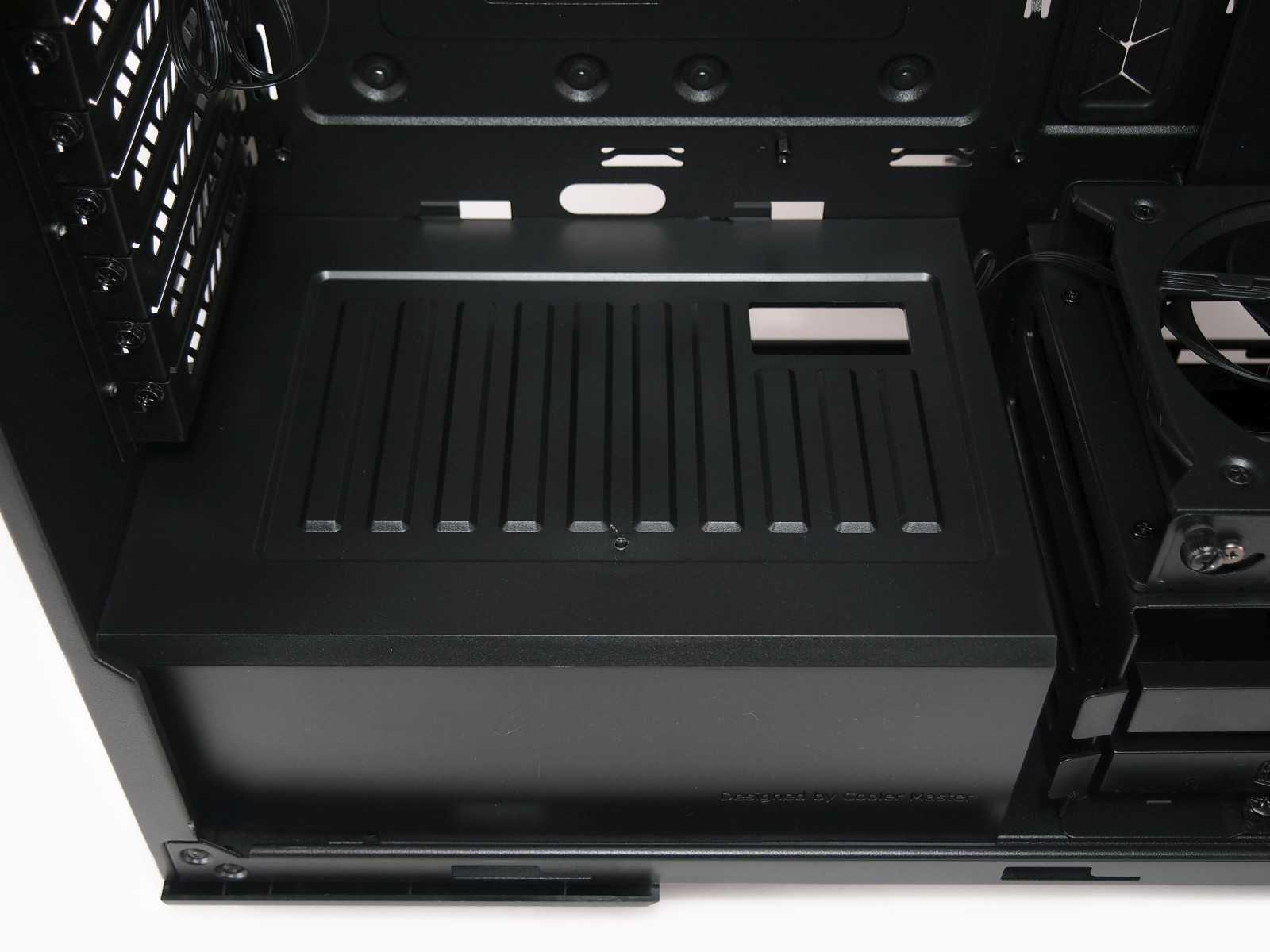 По умолчанию HAF 500 поддерживает блоки питания ATX длиной до 180 мм. Место для установки источника питания скрыто под пластиковым кожухом. Но если демонтировать съемную корзину в передней части кейса, то в HAF 500 можно установить блок питания практически любой длины.