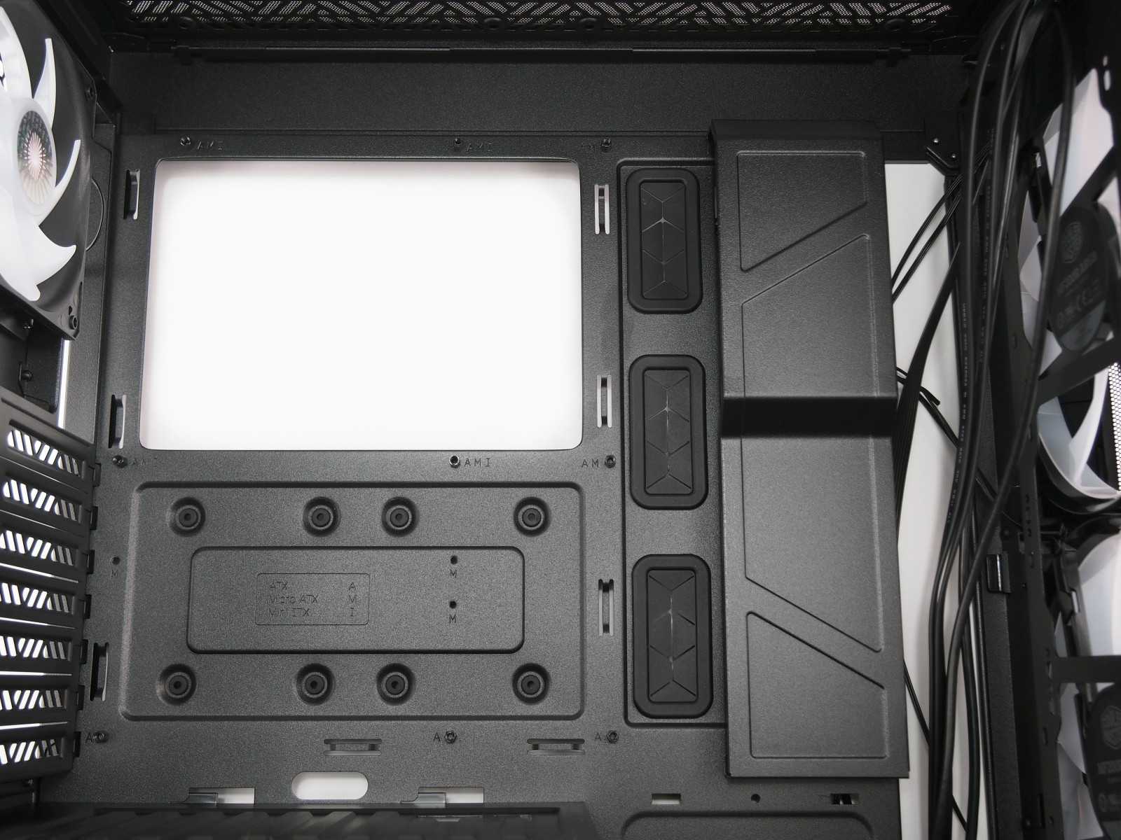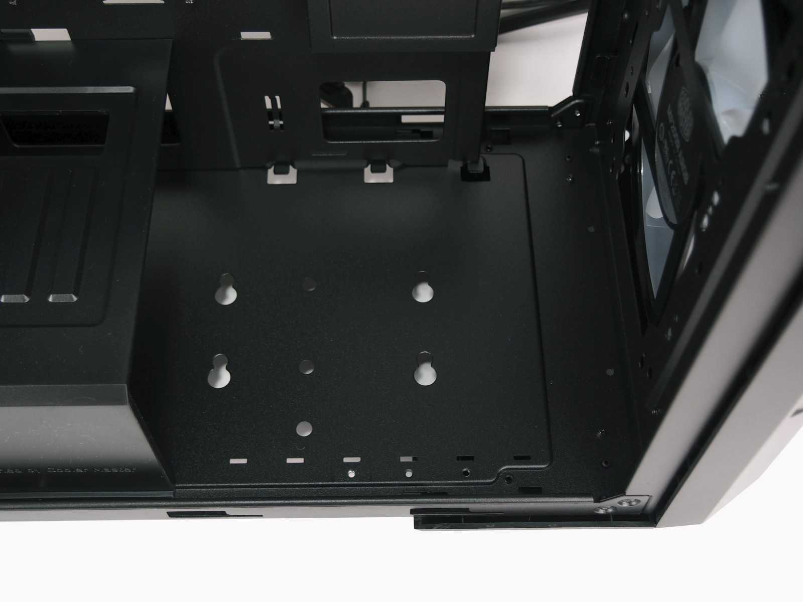 Если корзину для накопителей демонтировать, то, как уже говорилось выше, это снимет все ограничения на длину устанавливаемого блока питания. И в то же время позволит установить на переднюю стенку HAF 500 толстостенный радиатор СЖО кастомного типа. Достаточно аккуратно и продуманно выполнены на HAF 500 отверстия для протяжки кабелей. Предусмотрен ряд резиновых прокладок и декоративная панель, прикрывающая возможное кабельное безобразие.