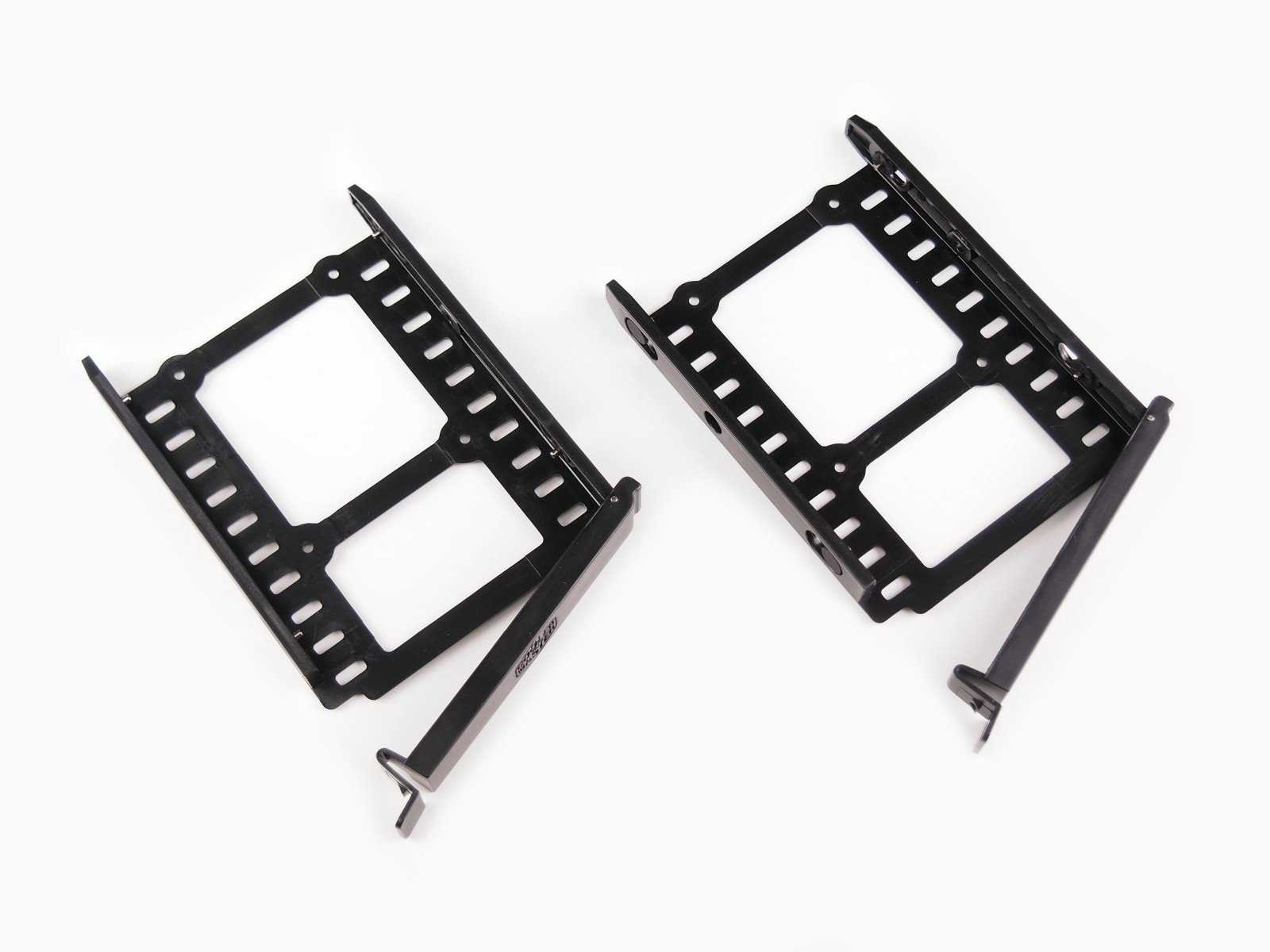 Корзина для накопителей включает в себя два пластиковых контейнера для пары 3.5″ или 2.5″ дисков. Еще два 2.5″ накопителя могут быть установлены на межсекционную стенку с внутренней стороны.