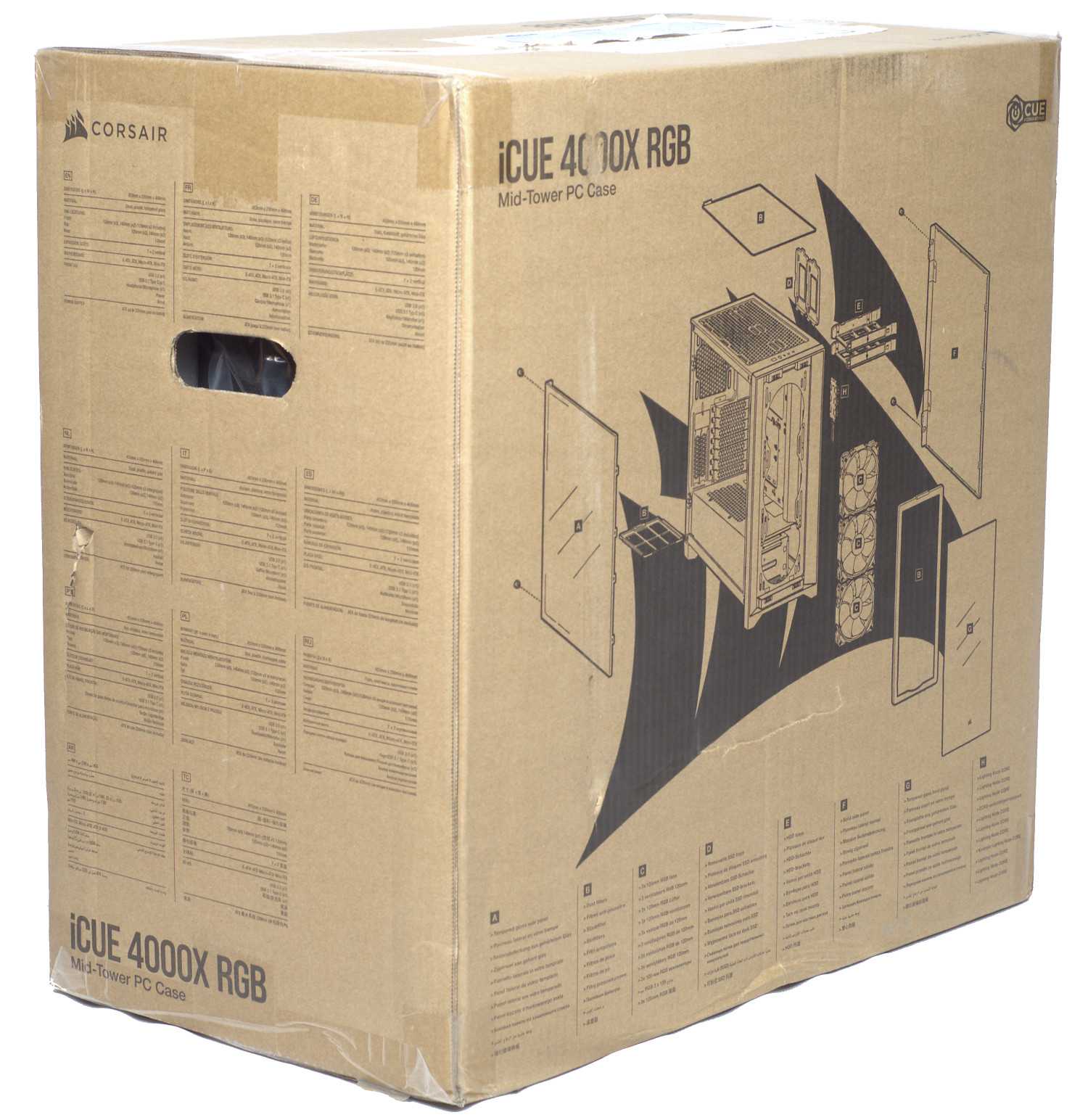 Mid-Tower корпус Corsair iCUE 4000X RGB поставляется в типовой картонной коробке, на которой представлен внешний вид корпуса, в том числе и в «разборе», указаны его технические характеристики, краткое многоязычное описание. На одном из торцов присутствует наклейка, которая указывает на конкретную модификацию. Если говорить об удобстве транспортировки, то с боков корпуса имеются выемки-ручки и это хорошо.