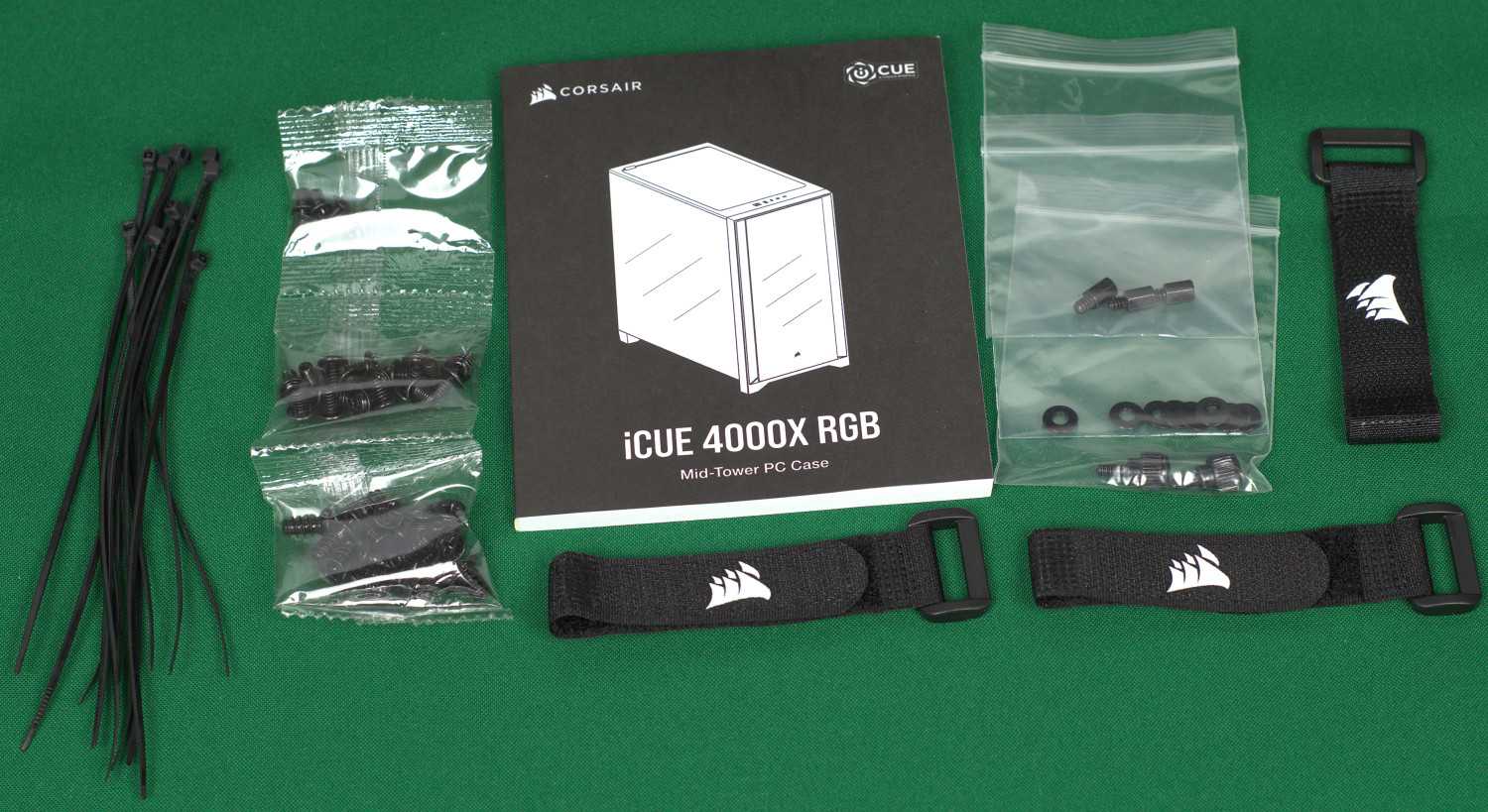Распаковав корпус, вы обнаружите, что он поставляется с некоторыми полезными аксессуарами, такими как все винты, которые могут вам потенциально понадобиться в сборке, включая винты размера M.2. По совпадению у меня был новый накопитель NVME, у которого не было никаких винтов, так что это избавило меня от поездки в местный магазин компьютерной техники. Вы также найдете полезное руководство пользователя, в котором подробно описаны функции и инструкции, а также комплект ремней для управления кабелями и некоторые дополнительные стойки для материнской платы. Corsair набрала несколько дополнительных баллов за удобство, так как у большинства обычных потребителей, вероятно, нет этих крошечных винтиков.