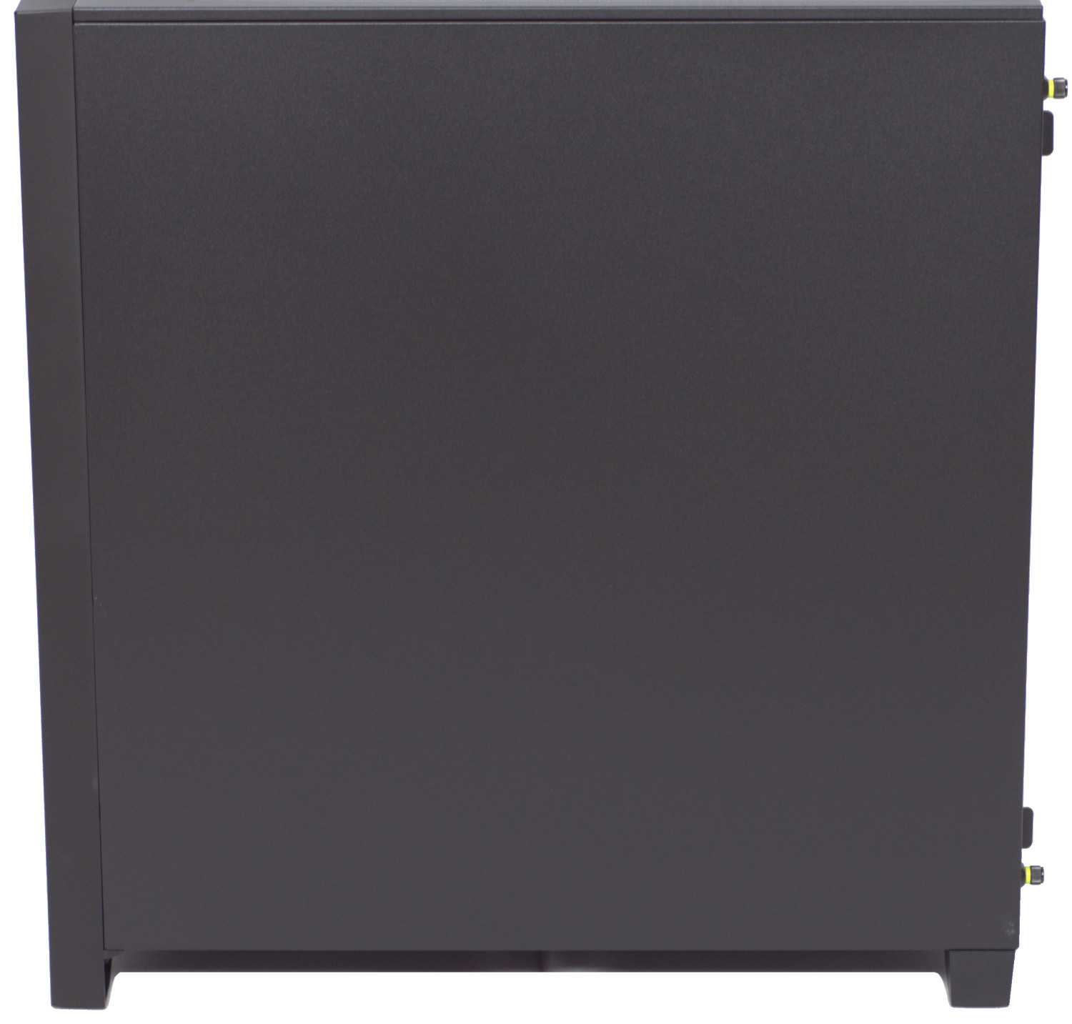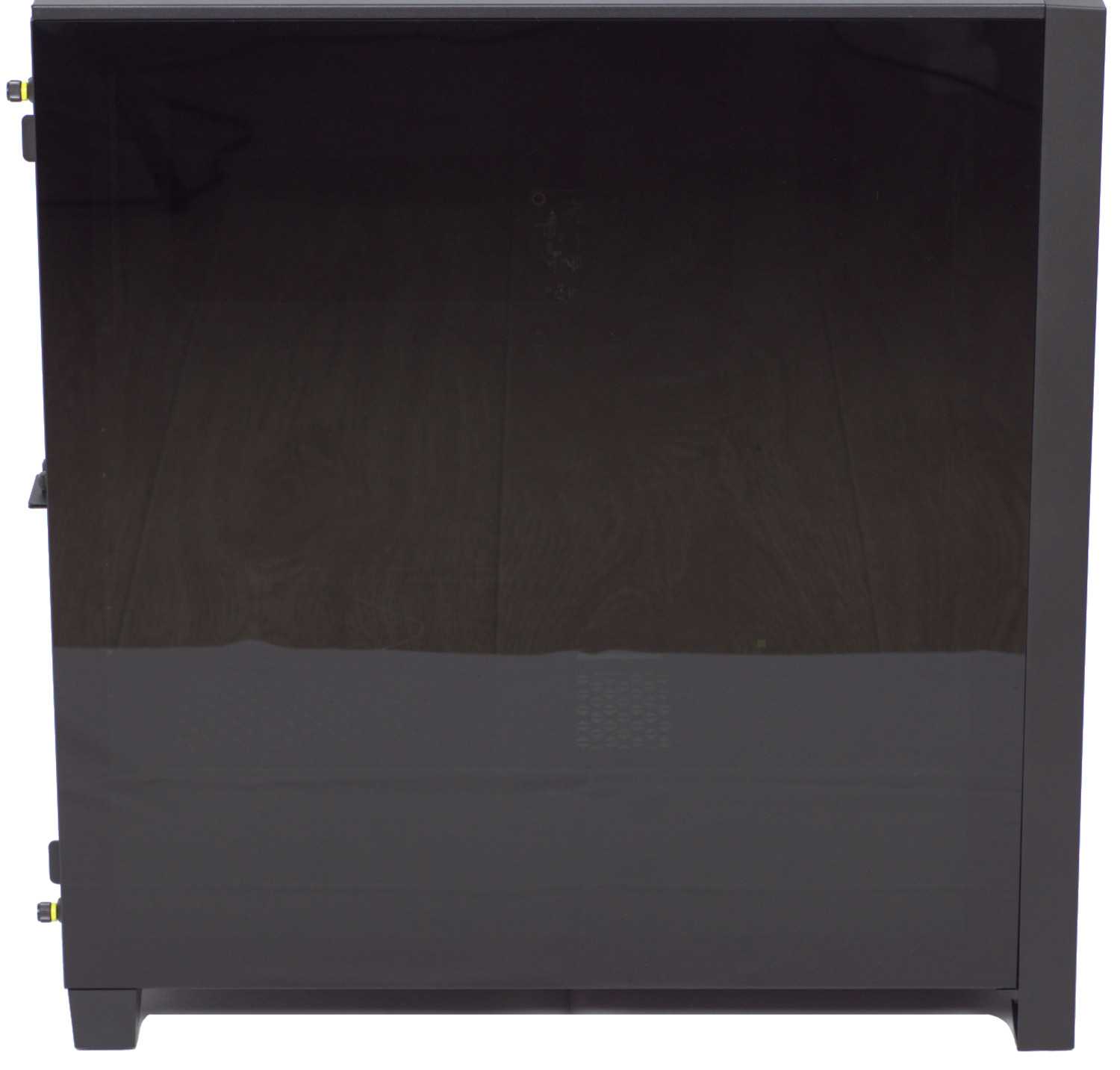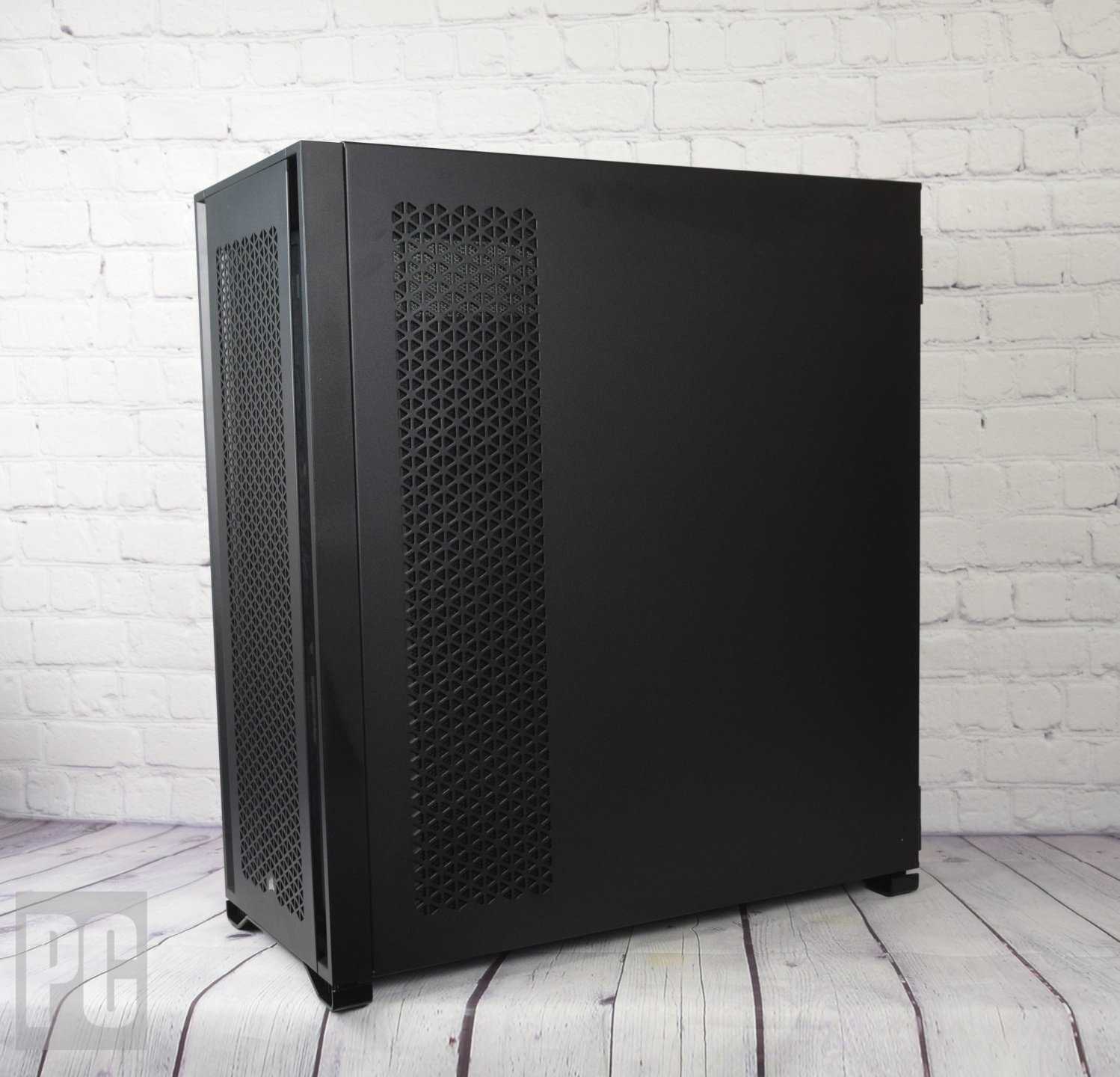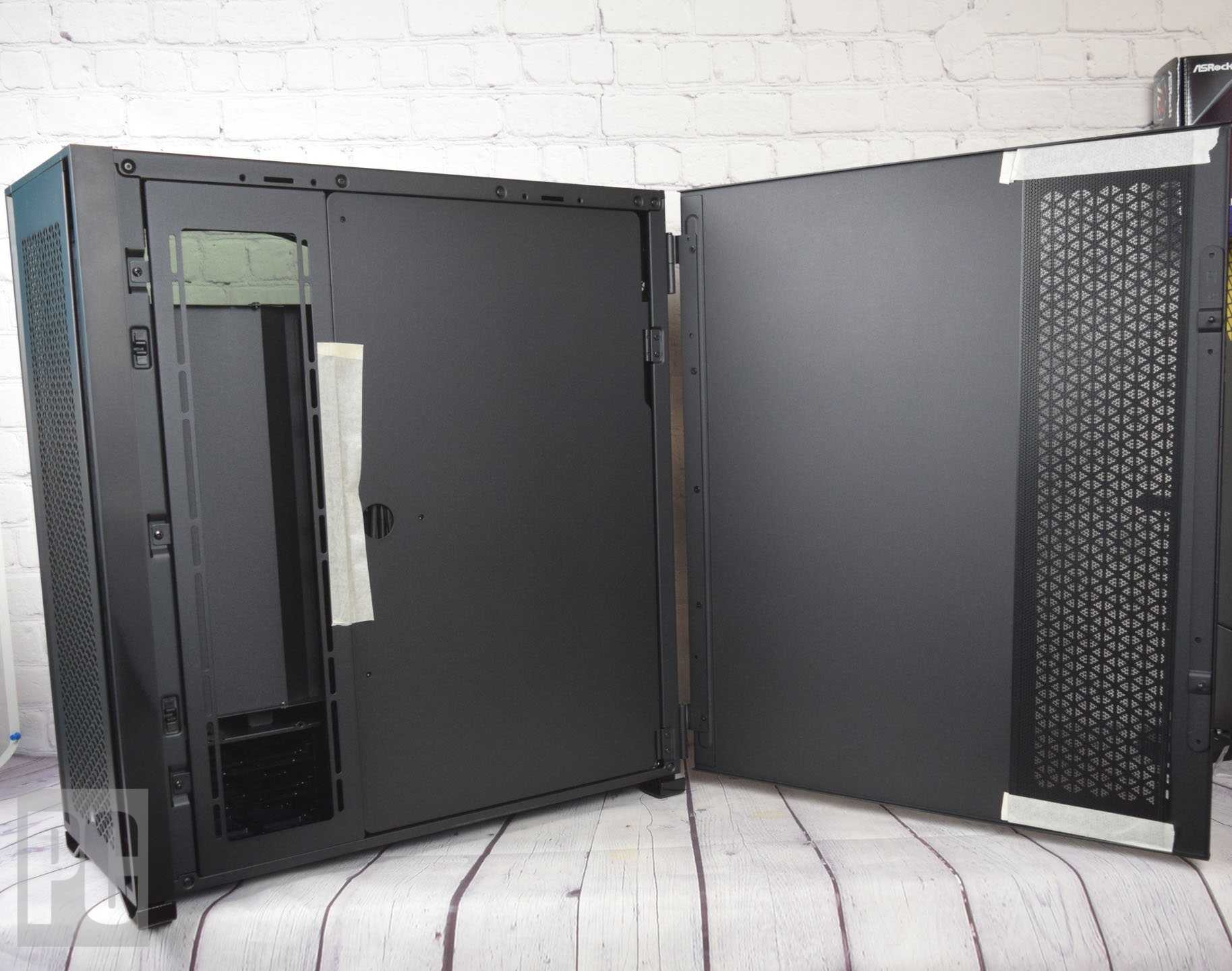 Боковины корпуса монолитные, без перфорации и отличаются типом материала: правая из стали, а левая из закаленного стекла с темной тонировкой.