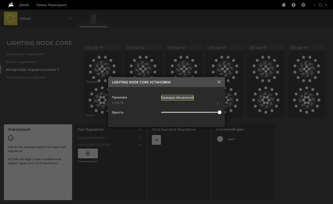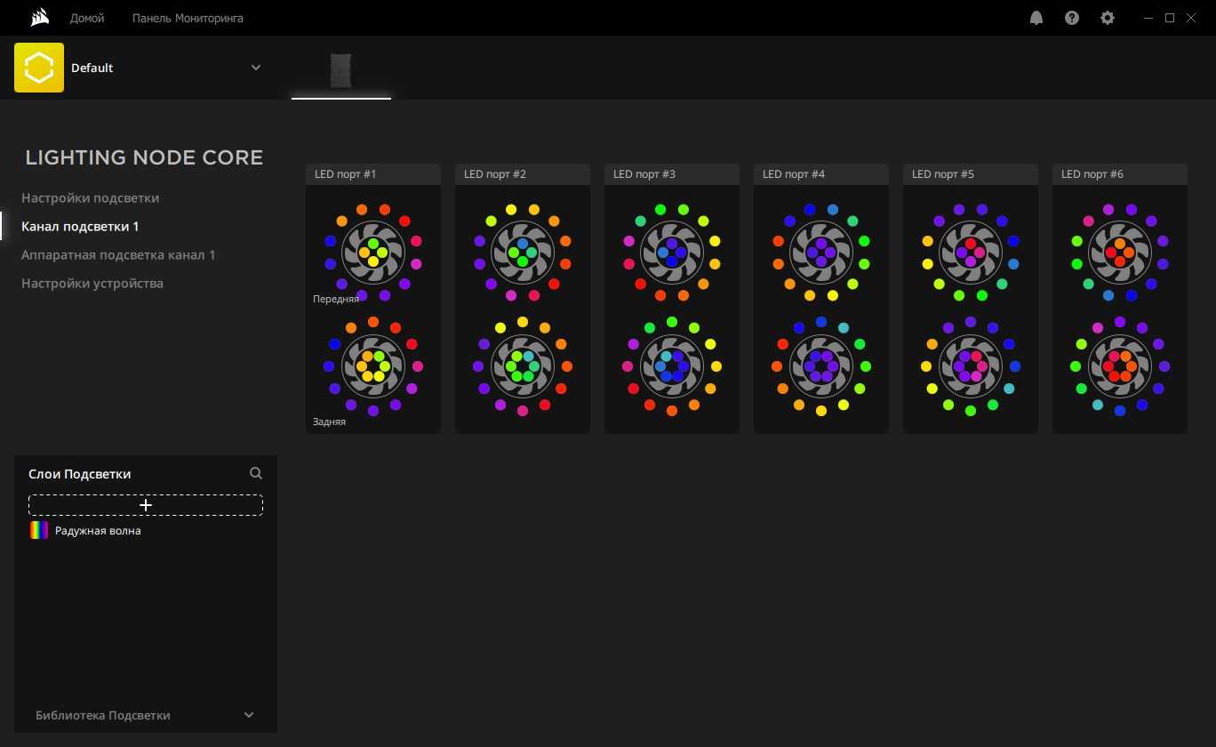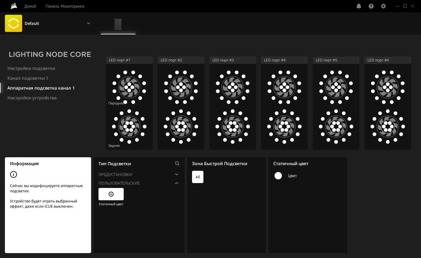В Mid-Tower корпусе Corsair iCUE 4000X RGB установлен контроллер iCUE Lighting Node CORE, поэтому управление подсветкой производится через фирменную утилиту Corsair iCUE.