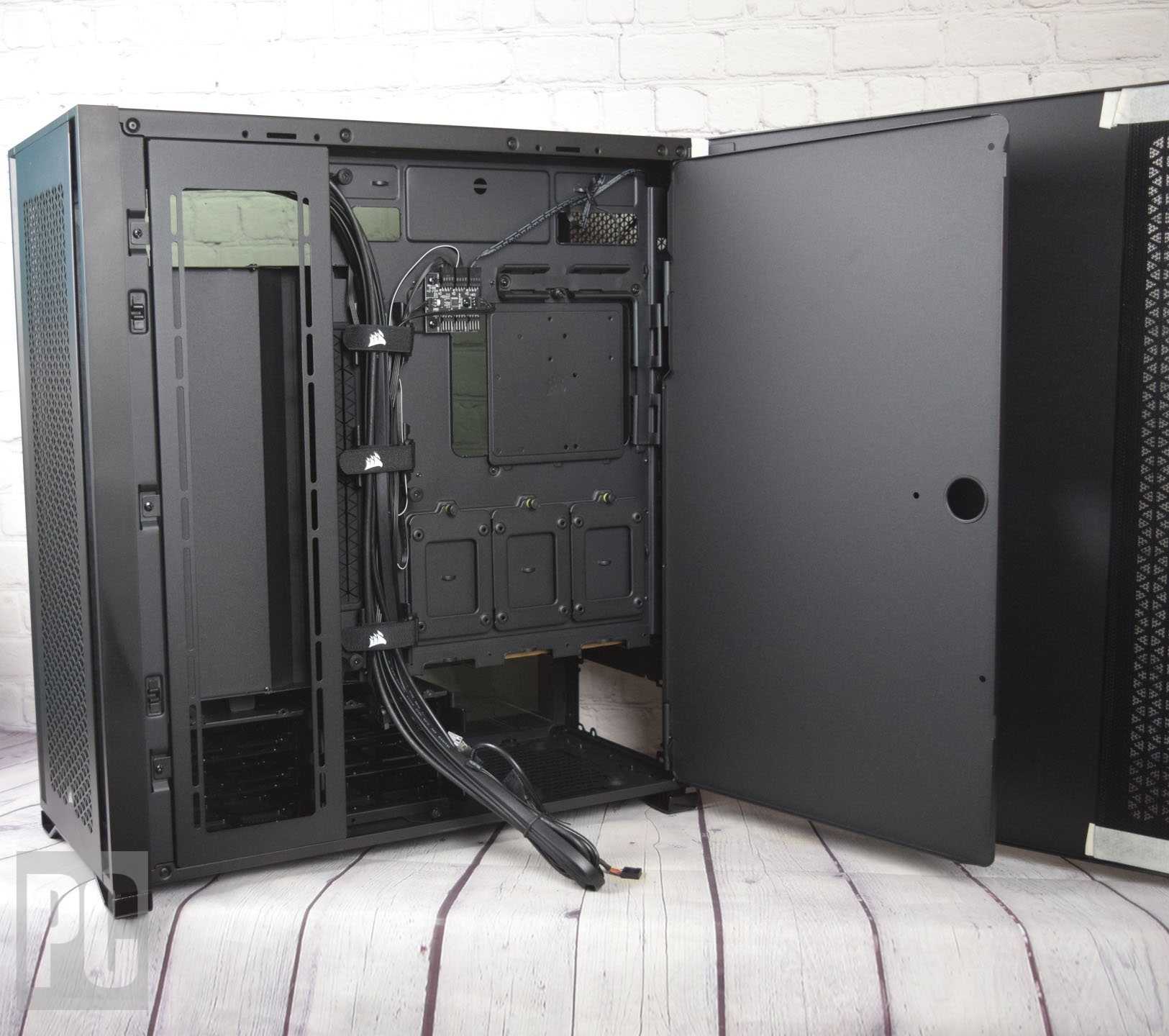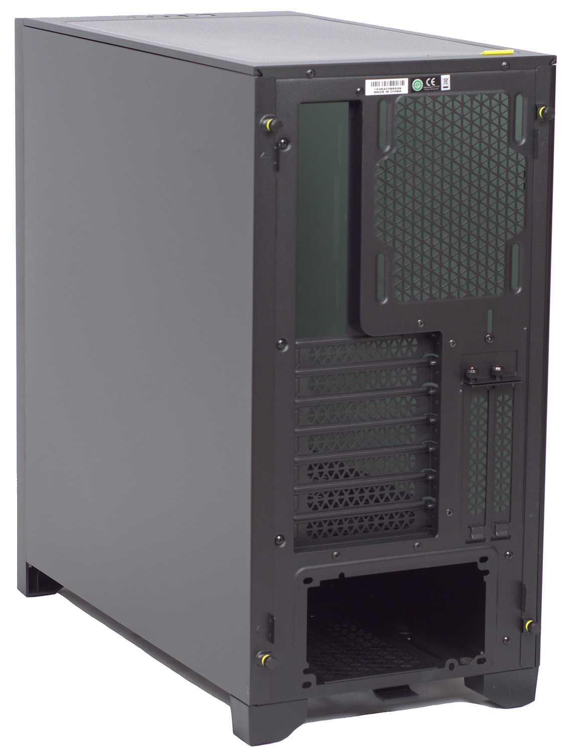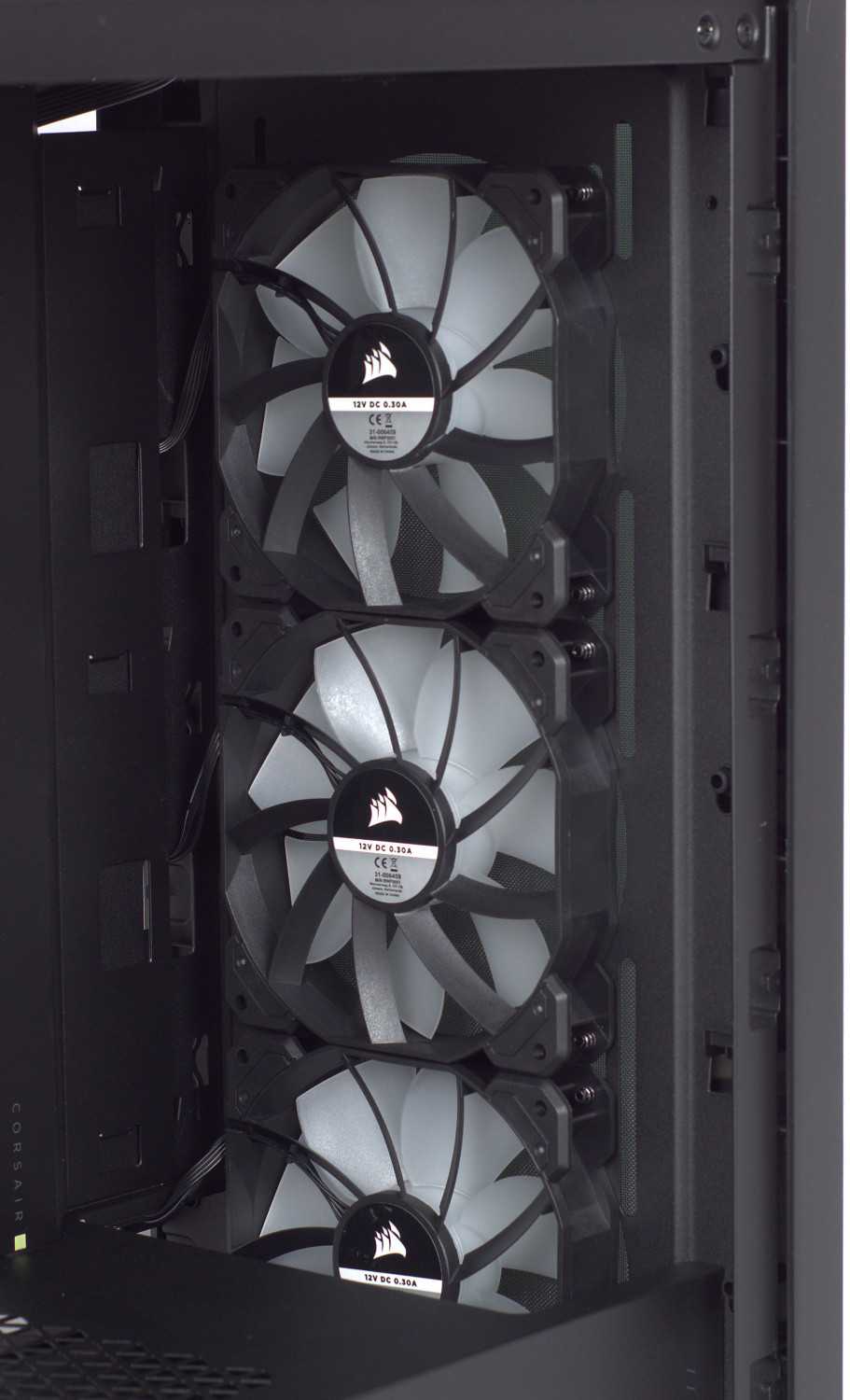 Передняя панель имеет закаленное стекло с темной тонировкой, через которое прекрасно видны три предустановленных 120 мм вентилятора Corsair с RGB-подсветкой. Приток воздуха спереди будет обеспечиваться через зазоры по бокам между стеклом и пластиком. Компоновка задней стенки современная – помимо семи горизонтальных отсеков под платы расширения имеются еще два вертикальных.