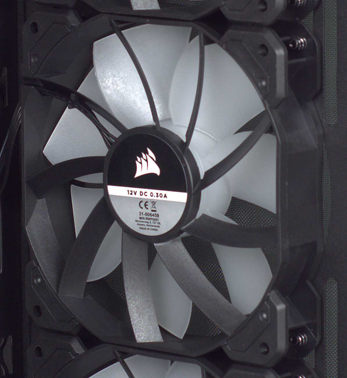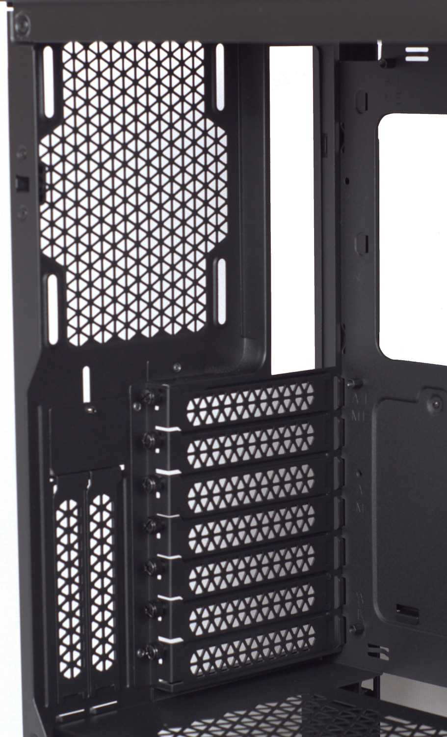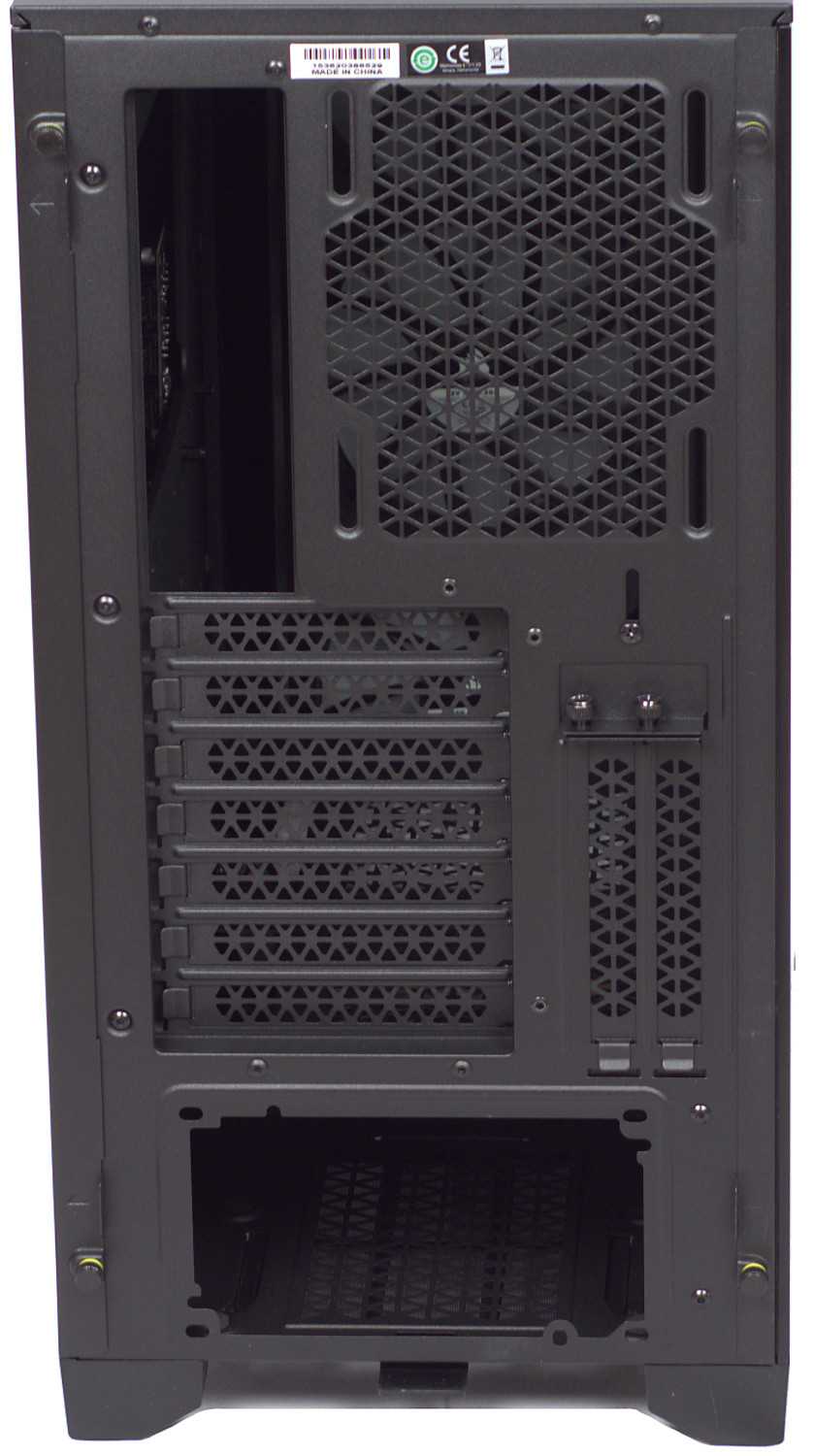 Особенность данной версии корпуса – это наличие трех предустановленных 120 мм вентилятора Corsair SP с RGB-подсветкой. Все они размещены спереди. Структура задней стенки – множественные области перфорации, в том числе и на заглушках слотов, как горизонтальных (7 шт), так и вертикальных (2 шт). На ней можно установить 120 мм вентилятор или радиатор СЖО.