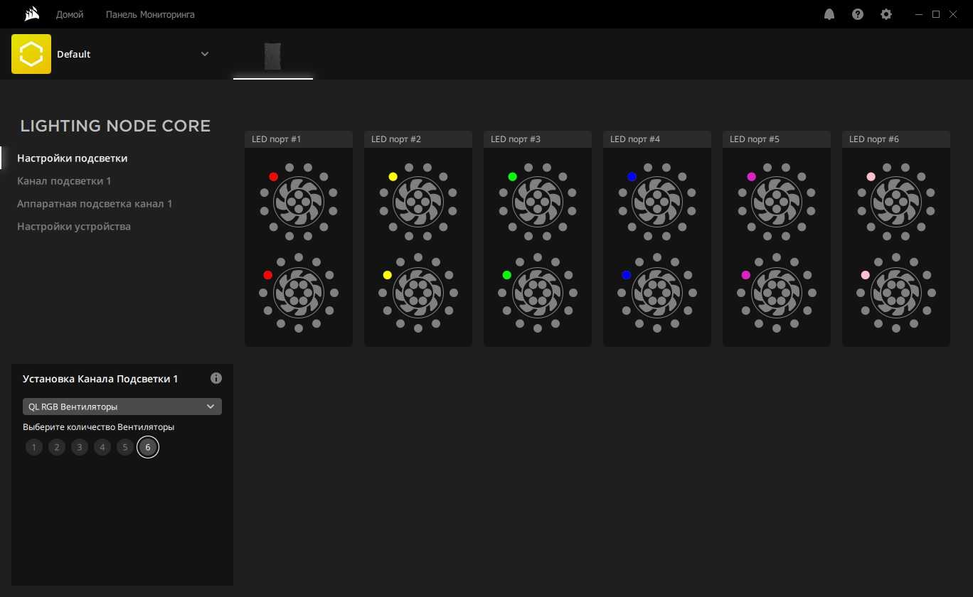 Так как контроллер не предполагает управление оборотами вентиляторов, то доступный набор действий сравнительно небольшой: «Настройка подсветки», где указываем тип и количество вентиляторов на канале 1, выбор эффектов с помощью вкладки «Канал подсветки 1»,…