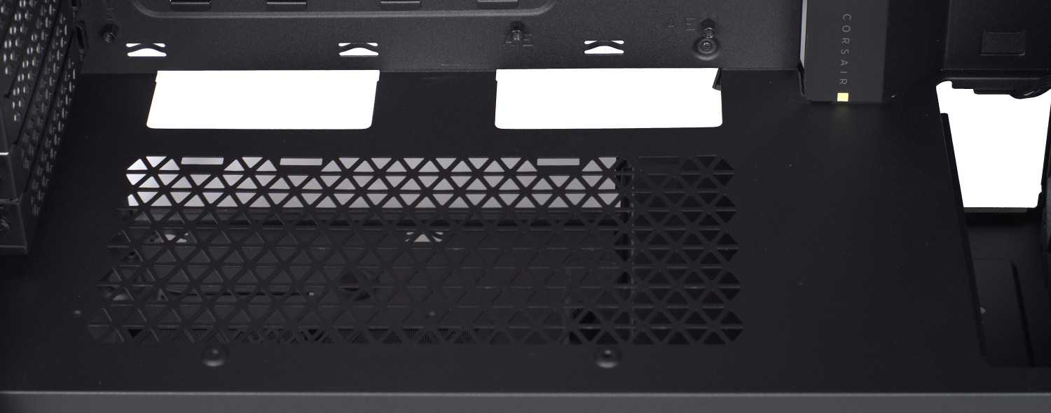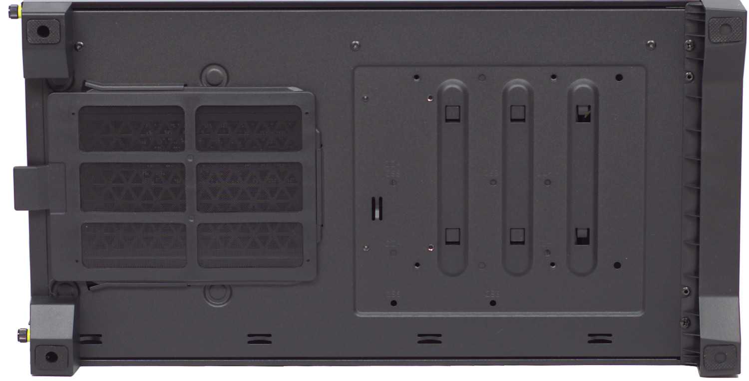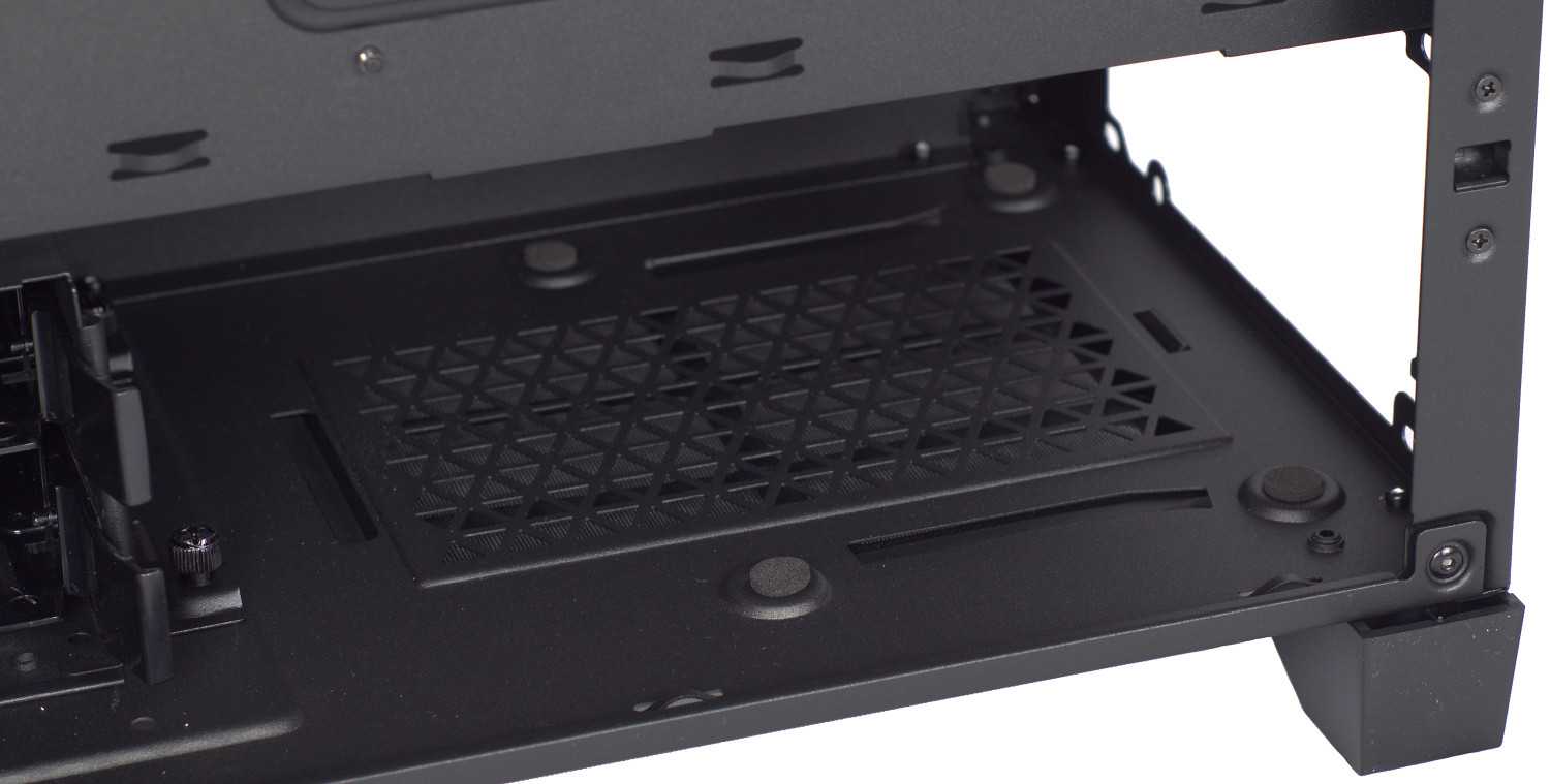 На дне корпуса перфорация предусмотрена только для области размещения блока питания, скрытая легкосъемным противопылевым фильтром. По компоновке видно, что корзину для накопителей можно смещать вправо/влево, чтобы можно было разместить длинный блок питания. Стоит отметить большую высоту ножек (30 мм), поэтому фильтр забиваться пылью будет не так часто.