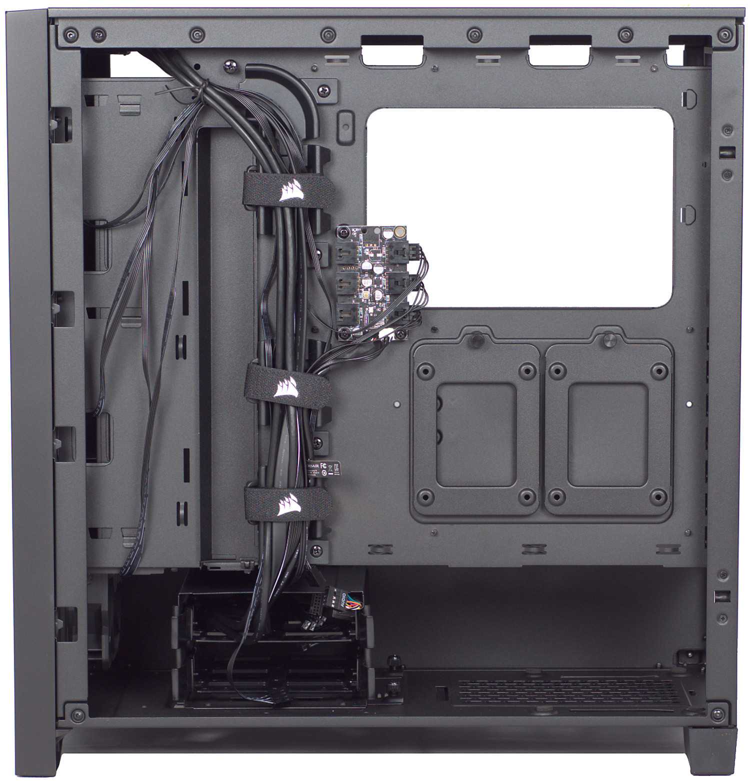 Так как в корпусе используются вентиляторы с RGB-подсветкой, то они подключены к контроллеру iCUE Lighting Node CORE, который отвечает за работу исключительно подсветки (до 6-и элементов), и подключается он к материнской плате через разъем USB 2.0 (управление идет через утилиту Corsair iCUE). Использование пульта дистанционного управления не предусмотрено. Питание самих вентиляторов должно осуществляться отдельно (от материнской платы). Отметим, что в поддоне есть сплошное Г-образное окно, через которое можно вывести кабели к материнской плате в любом месте, а значит совместимость с платами максимальная.