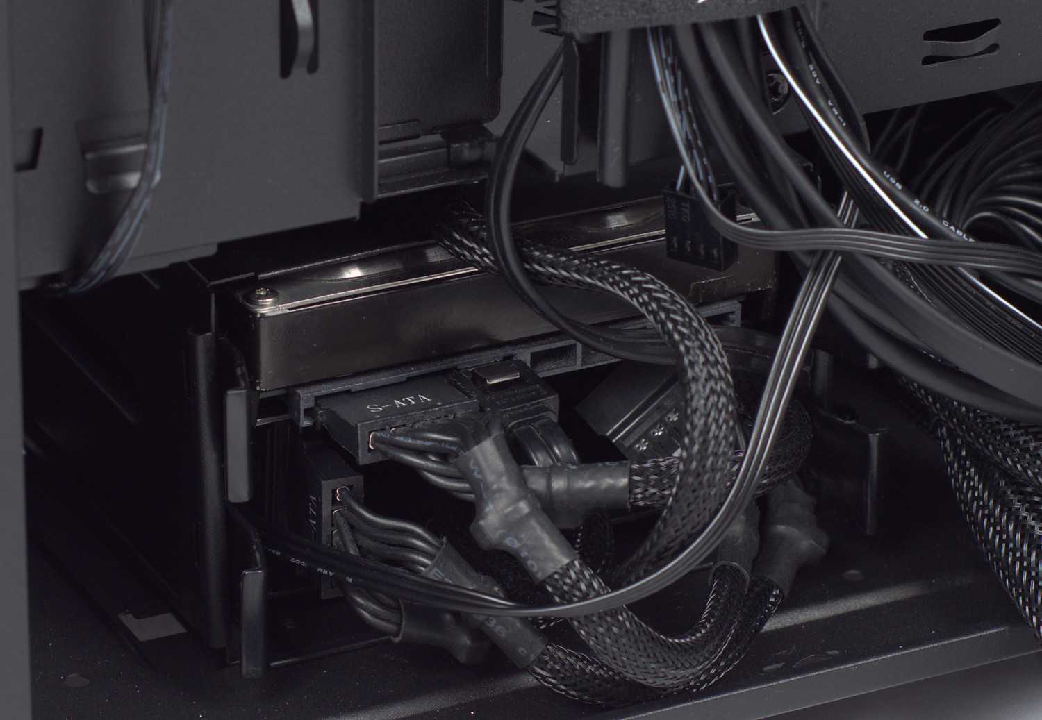 Зона размещения ATX блока питания достаточно вместительная и при необходимости может быть увеличена за счет сдвига ближе к передней части корзины под накопители (до 180 мм с корзиной) или даже ее демонтажа (заявлена длина блока питания до 200 мм).