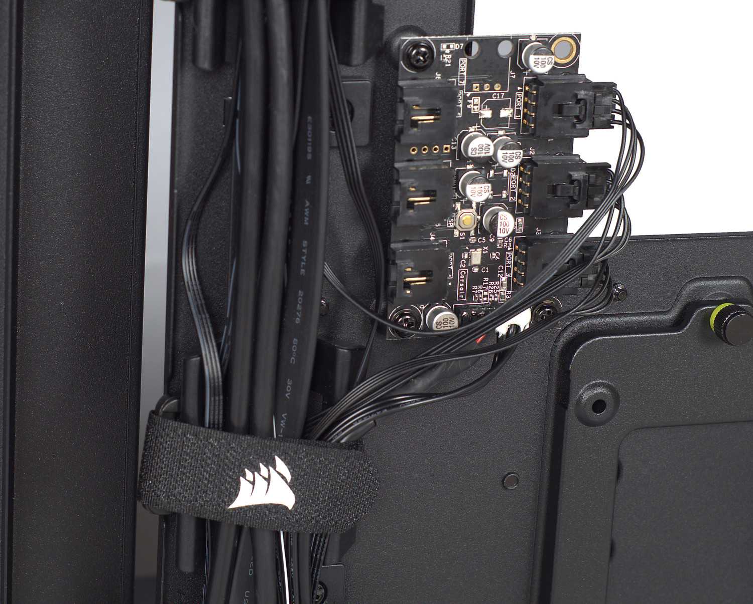 Освещение управляется встроенным ядром узла освещения iCue, которое взаимодействует с материнской платой через 9-контактное USB-соединение, а вентиляторы питаются через SATA. Вы также заметите, что на узле есть место для трех дополнительных вентиляторов RGB. Их невероятно легко настроить, и Corsair уже позаботился о проводах с включенными вентиляторами. Однако в основном случае проводка немного ленивая, поэтому тем, кто хочет получить максимально чистый вид, придется заново пропустить некоторые провода, чтобы они были полностью скрыты. Это не сложная задача, но кажется странным, что Corsair изначально не удосужился сделать это таким образом.
