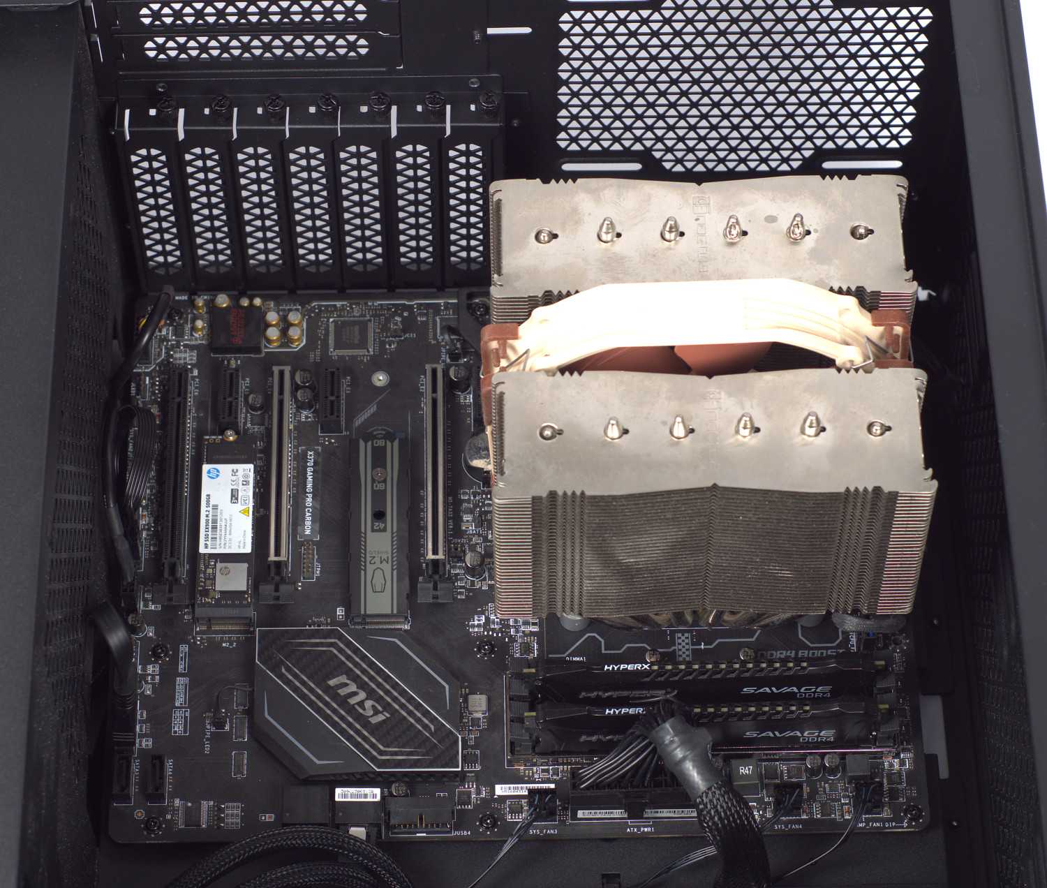 Следующий этап – материнская плата с системой охлаждения. В очередной раз отметим небольшое расстояние от верхнего края материнской платы до стенки, что потенциально может сделать невозможным установку 280 мм радиатора из-за высоких модулей памяти или высоких элементов материнской платы (радиатор системы питания).