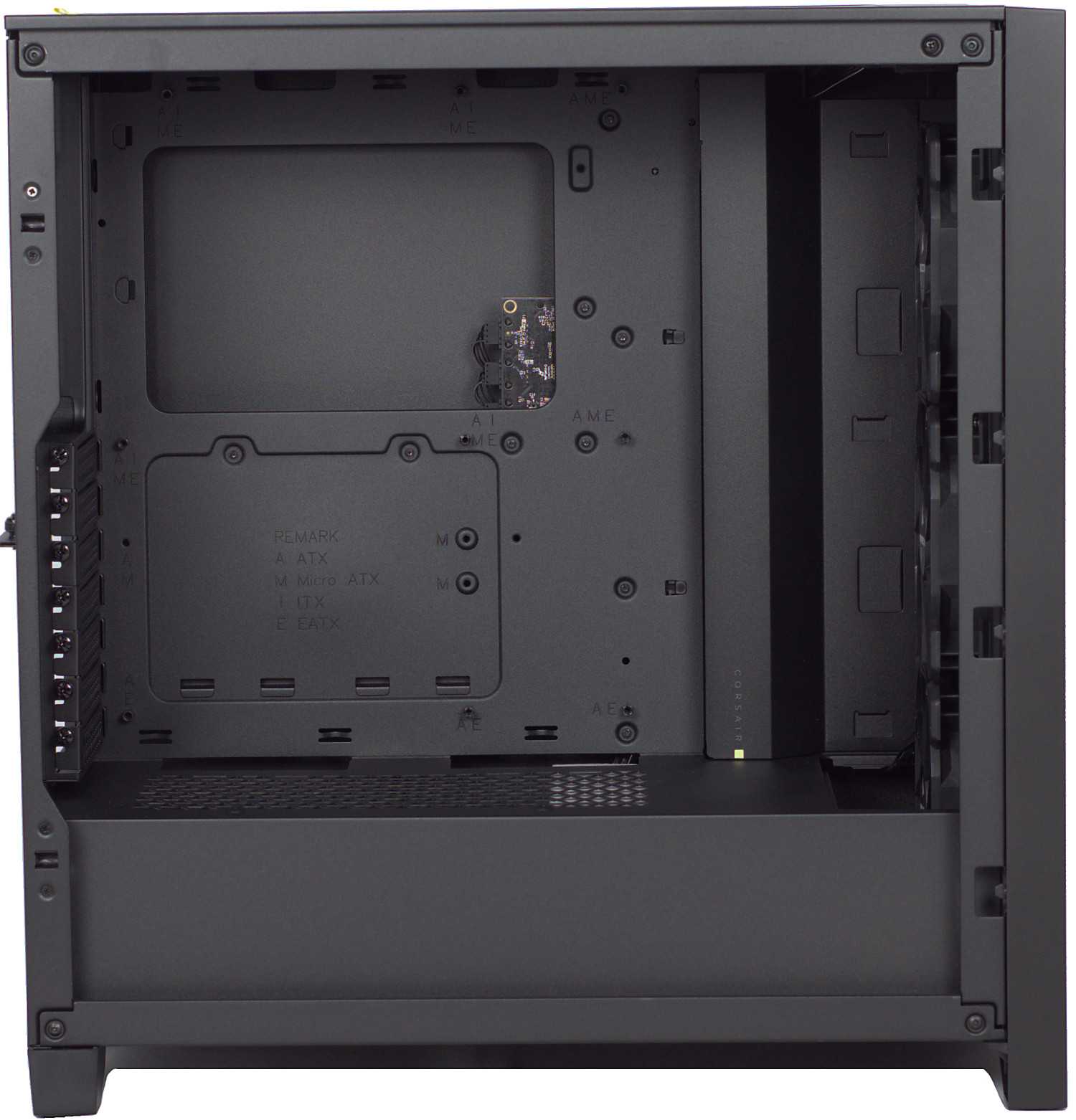 Внутренняя компоновка Mid-Tower корпуса Corsair iCUE 4000X RGB практически ничем не отличается от других современных моделей, но и, конечно же, есть свои особенности. В нем предусмотрены крепления для установки материнских плат вплоть до форм-фактора E-ATX (305 мм х 277 мм), плат расширения длиной до 360 мм и кулера высотой до 170 мм