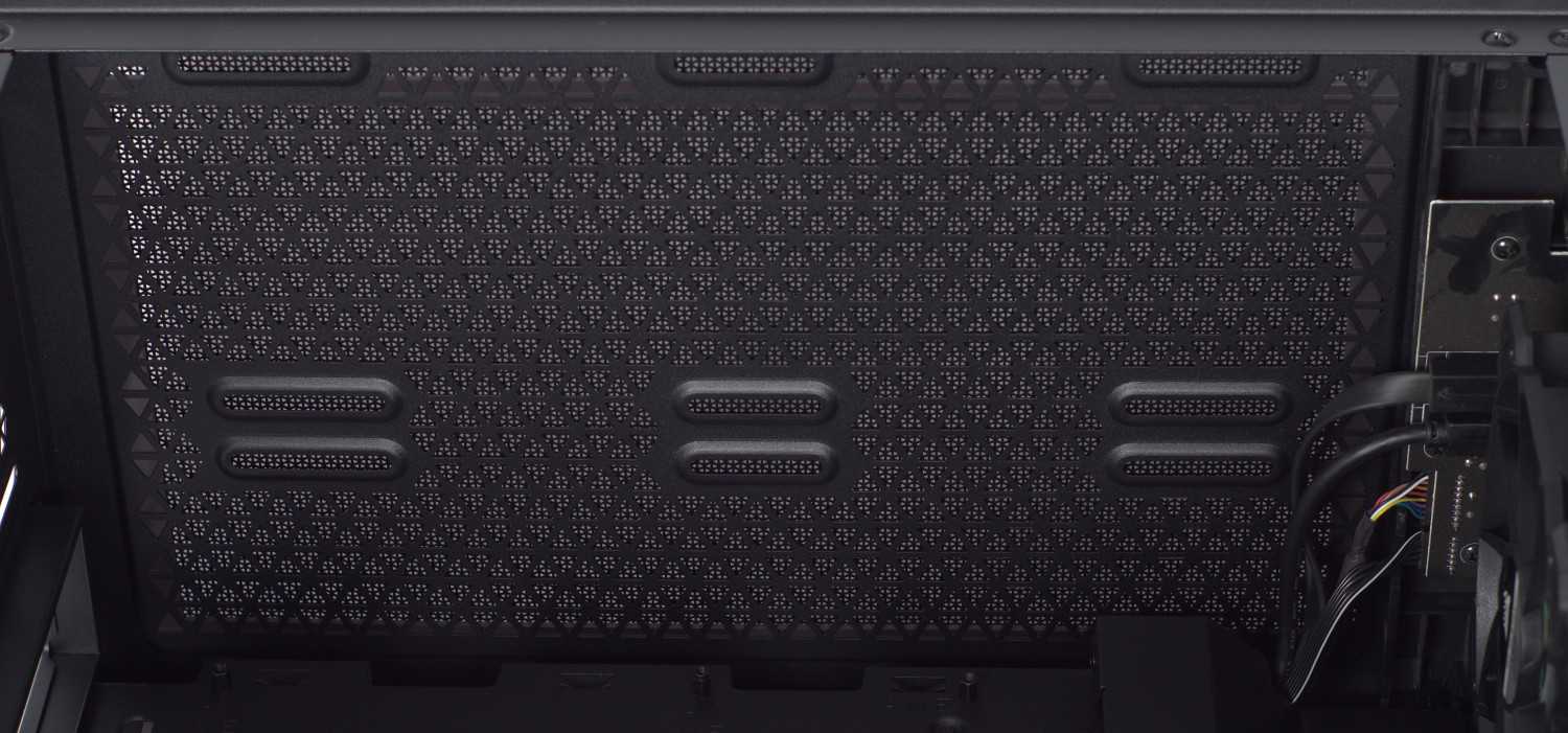 Структура перфорации – треугольники и заметны посадочные места под два 120/140 мм вентилятора или 240/280 мм радиатор системы жидкостного охлаждения (СЖО).