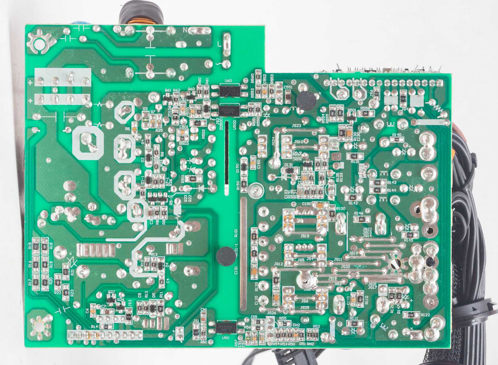 Обратная сторона платы выполнена аккуратно, имеются усиленные перемычками дорожки, следов несмытого флюса не замечено. В целом вся сборка выполнена аккуратно.