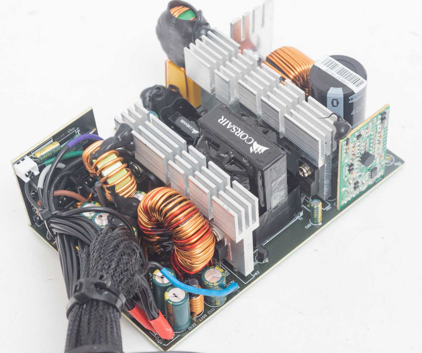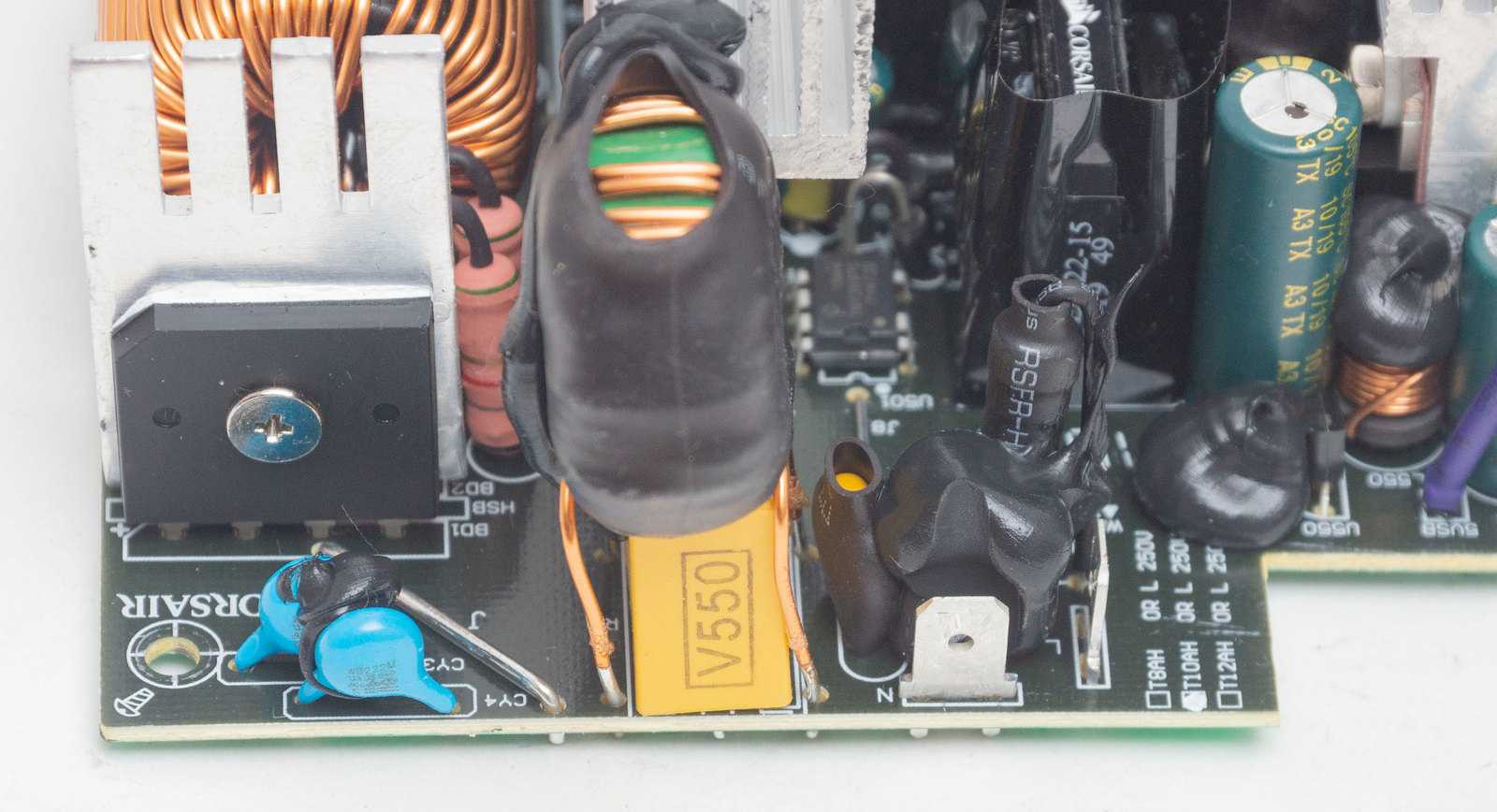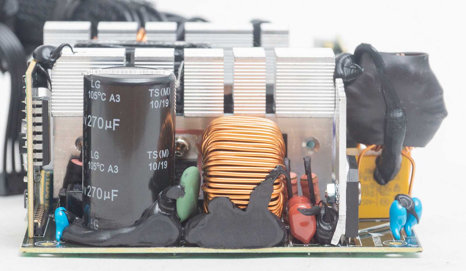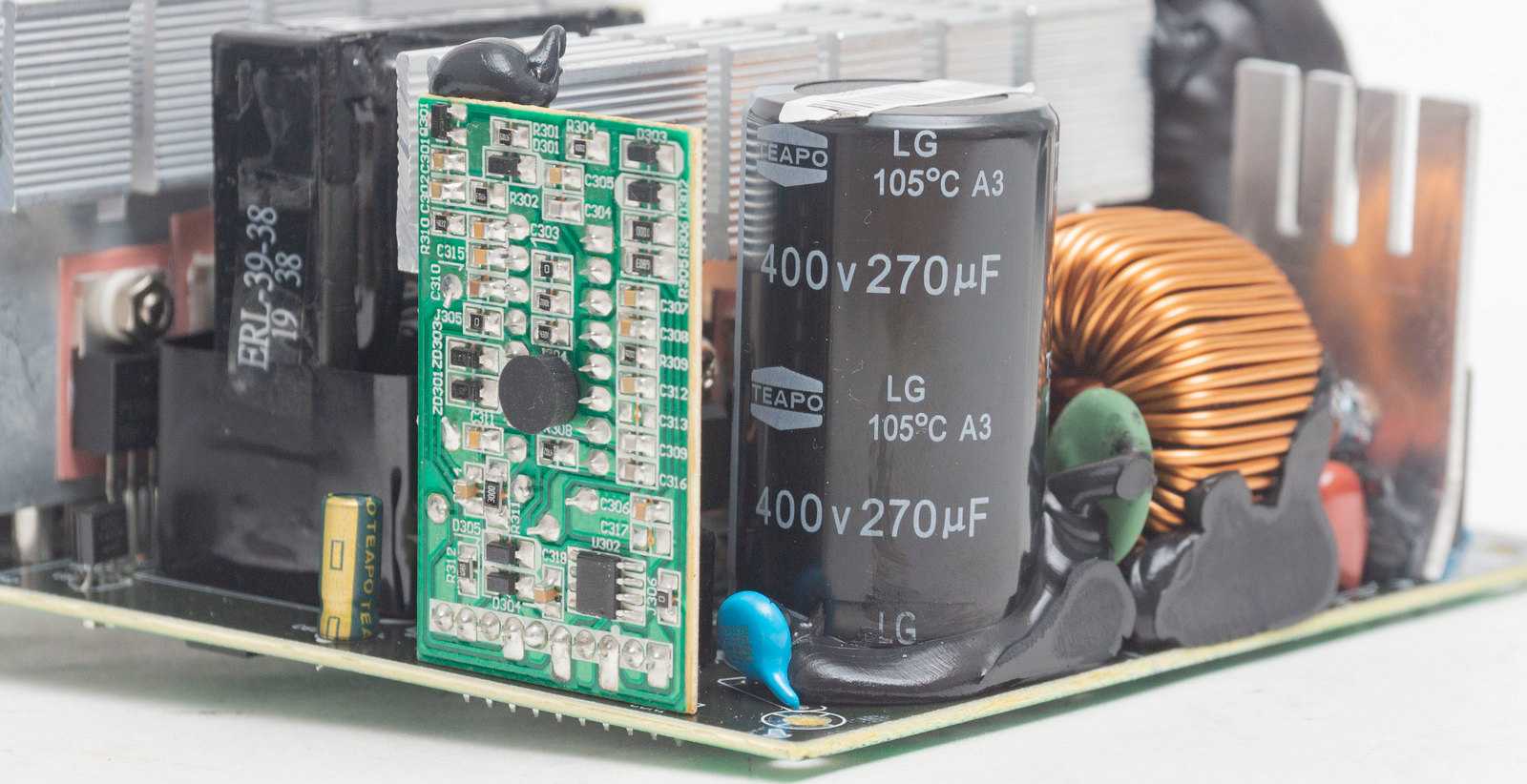 Сглаживающий высоковольтный конденсатор производства тайваньской Teapo высокотемпературной серии 105 °C, ёмкостью 270 мкФ рассчитан на напряжение 400 В. Емкость для пятисотваттного БП минимальная, обычно устанавливают по 330 мкФ.